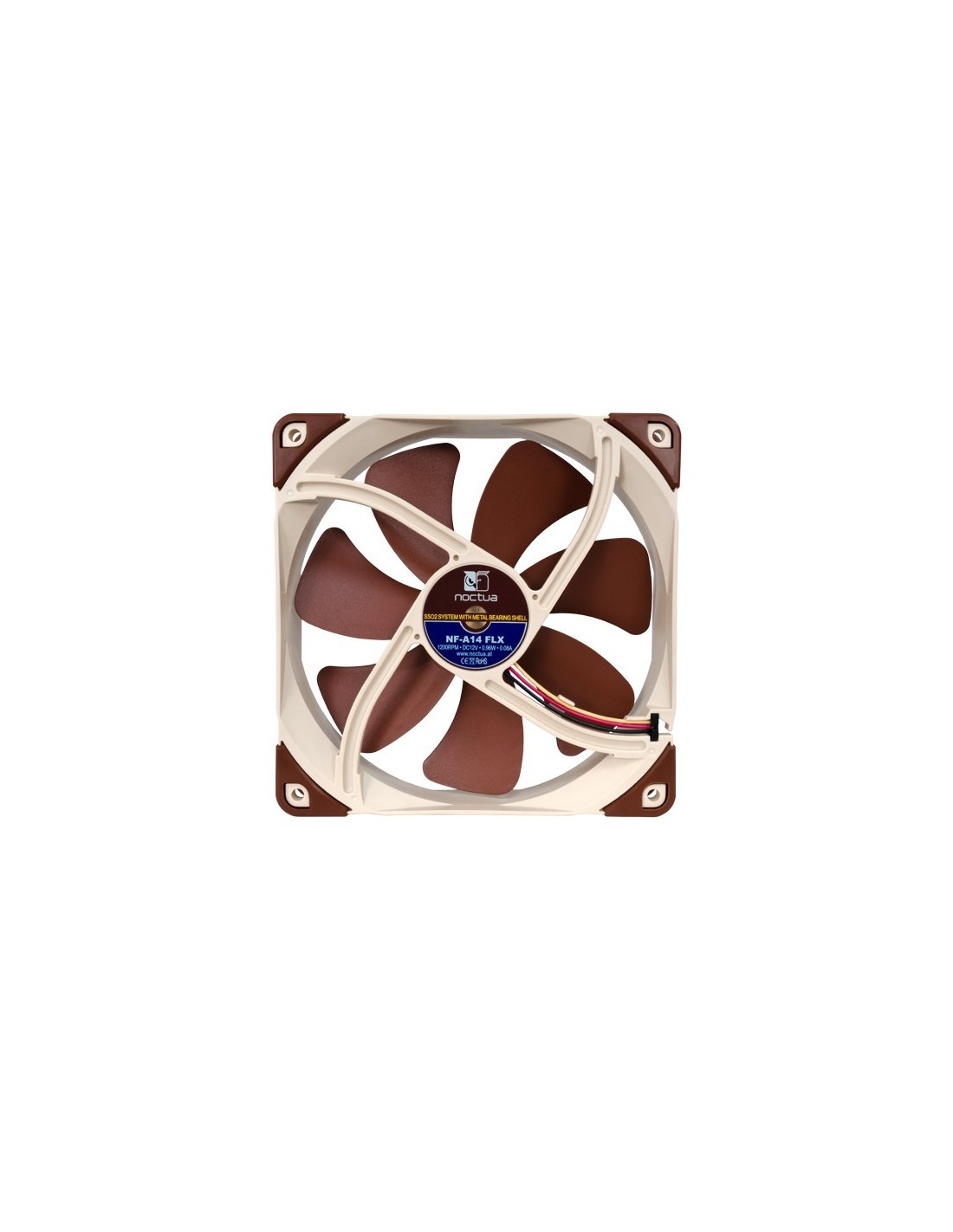 Noctua NF-A14 FLX. Tipo: Ventilador, Diámetro de ventilador: 14 cm, Velocidad de rotación (máx.): 1200 RPM, flujo de aire: 115,5 m³/h, Presión máxima de aire: 1,51 mmH2O. Voltaje: 12 V. Ancho: 140 mm, Profundidad: 140 mm, Altura: 25 mm