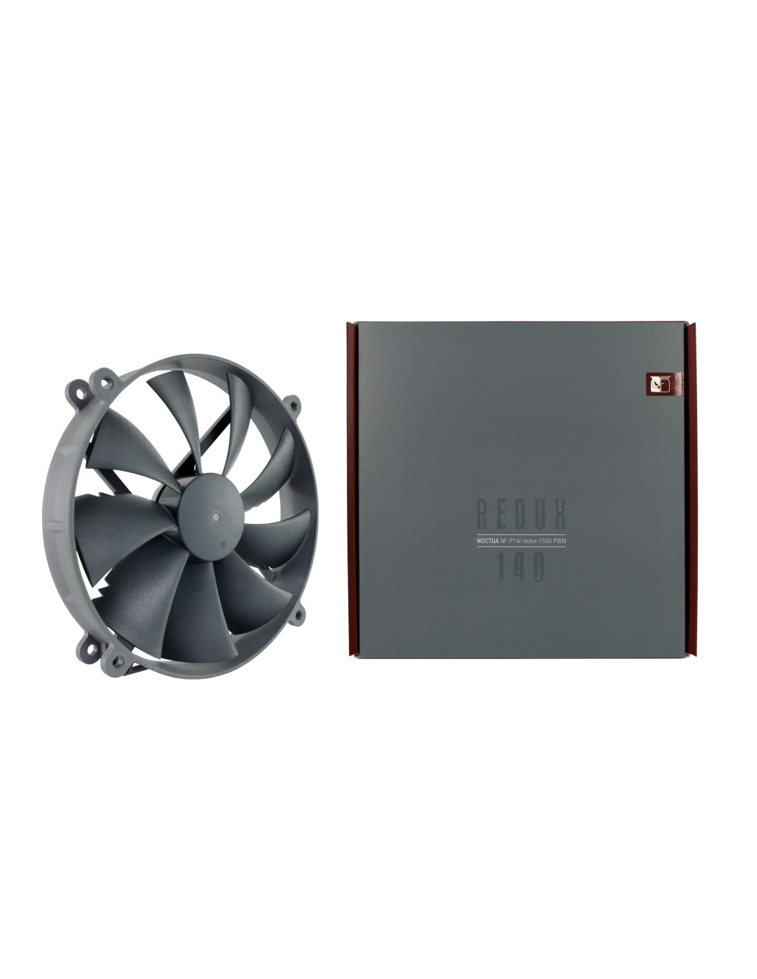 Noctua NF-P14R REDUX-1500 PWM. Tipo: Ventilador, Diámetro de ventilador: 14 cm, Velocidad de rotación (mín.): 450 RPM, Velocidad de rotación (máx.): 1500 RPM, flujo de aire: 133,7 m³/h, Tipo de soporte: Self-Stabilising Oil-pressure (SSO) bearing. Ancho: 140 mm, Profundidad: 140 mm, Altura: 25 mm. Color del producto: Gris