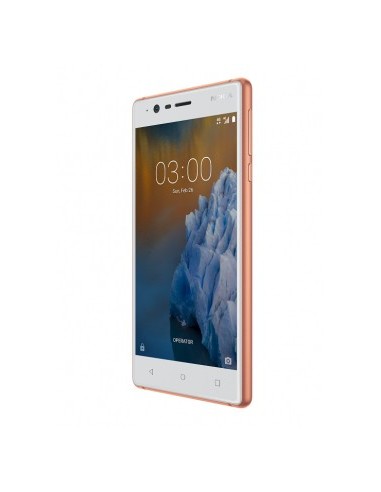 Nokia 3. Diagonal de la pantalla: 12,7 cm (5"), Resolución de la pantalla: 1280 x 720 Pixeles. Frecuencia del procesador: 1,3 GHz, Familia de procesador: MediaTek, Modelo del procesador: MT6737. Capacidad de RAM: 2 GB, Capacidad de almacenamiento interno: 16 GB. Resolución de la cámara trasera (numérica): 8 MP, Tipo de cámara trasera: Cámara única. Capacidad de la tarjeta SIM: SIM doble. Sistema operativo instalado: Android 7.0. Capacidad de batería: 2630 mAh. Color del producto: Cobre, Blanco. Peso: 140 g