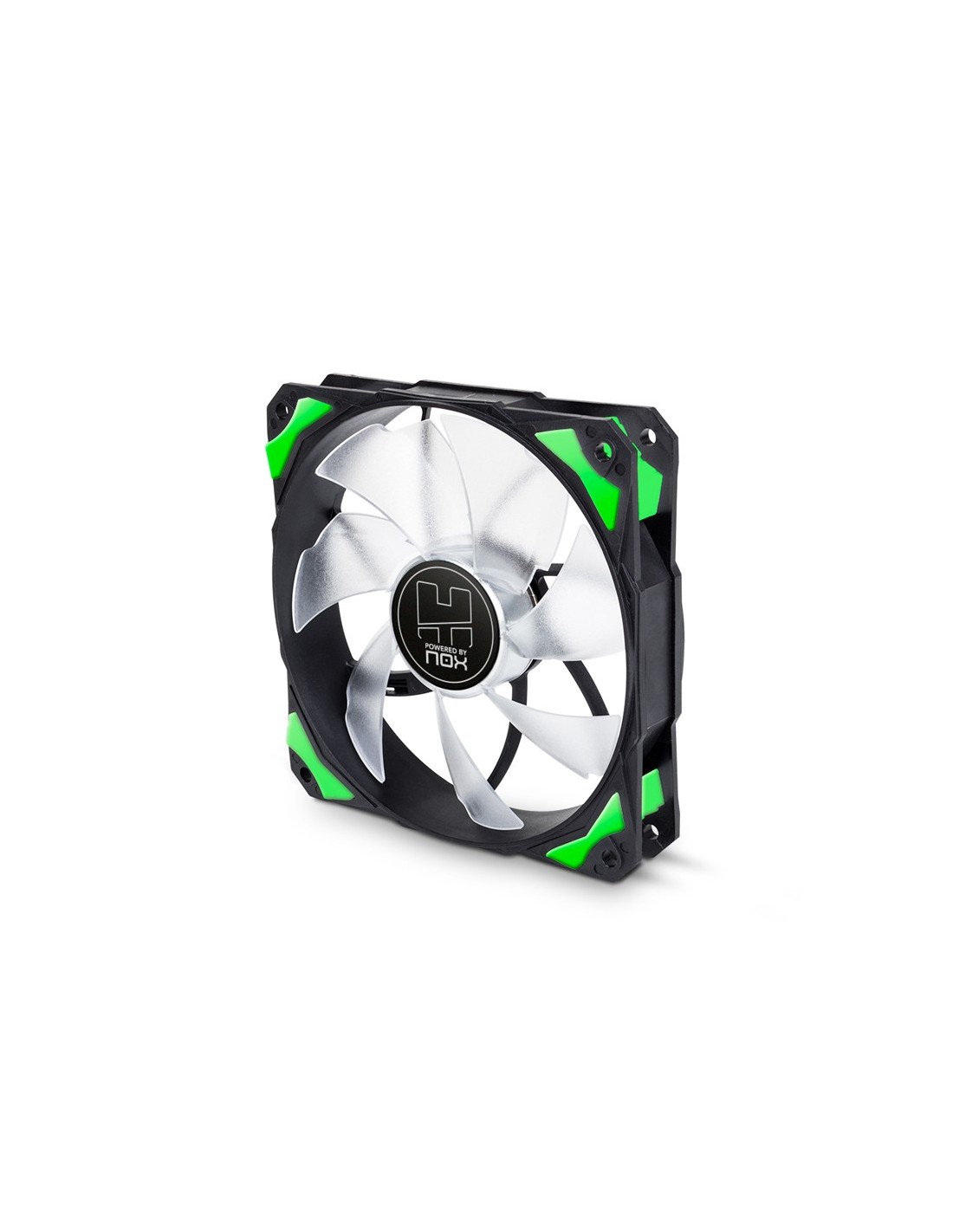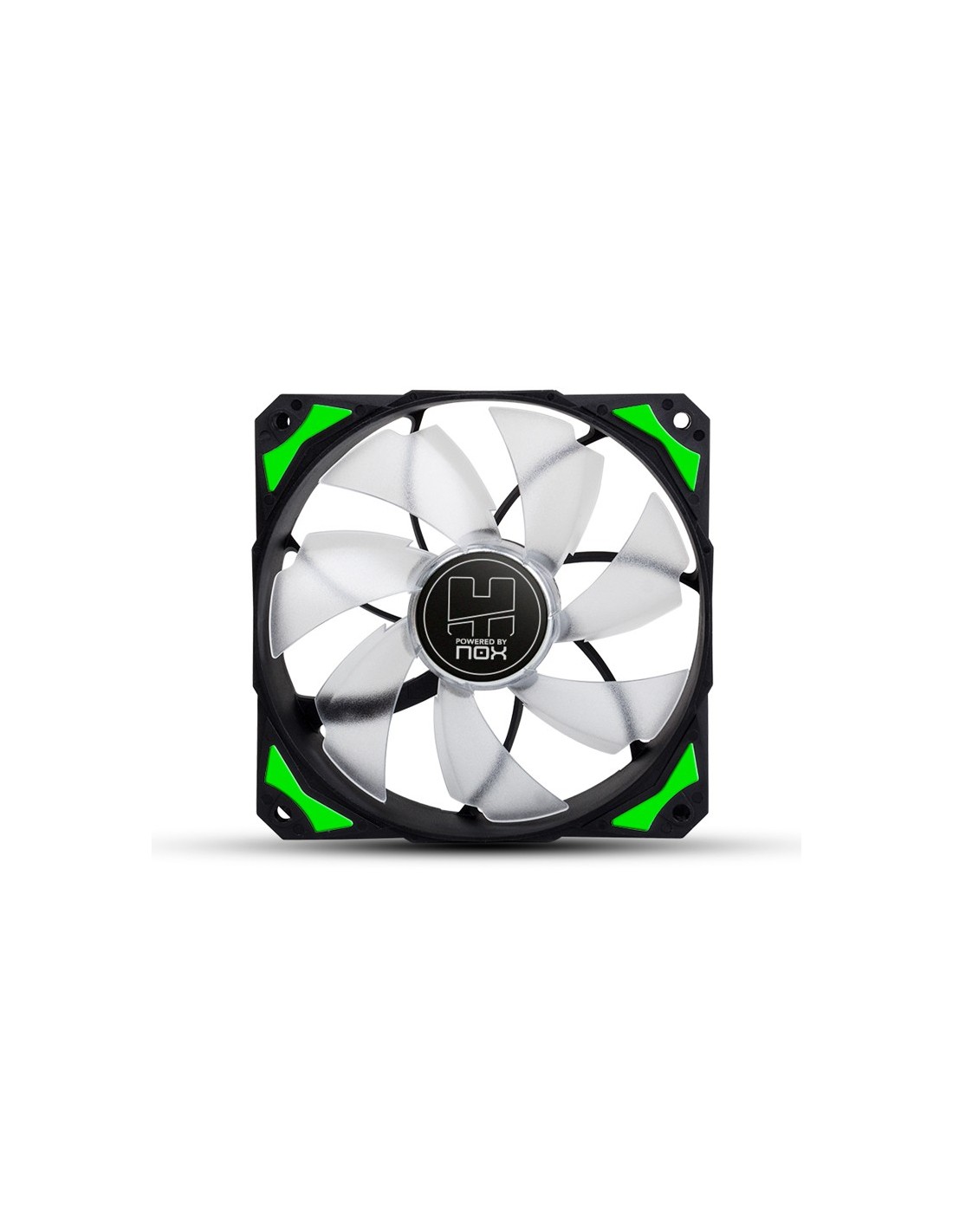 NOX Hummer H-Fan LED. Tipo: Ventilador, Diámetro de ventilador: 12 cm, Velocidad de rotación (mín.): 1000 RPM, Velocidad de rotación (máx.): 1600 RPM, Presión de aire mínima: 0,7 mmH2O, Presión máxima de aire: 1,81 mmH2O. Voltaje: 12 V. Color del producto: Negro, Verde, Blanco