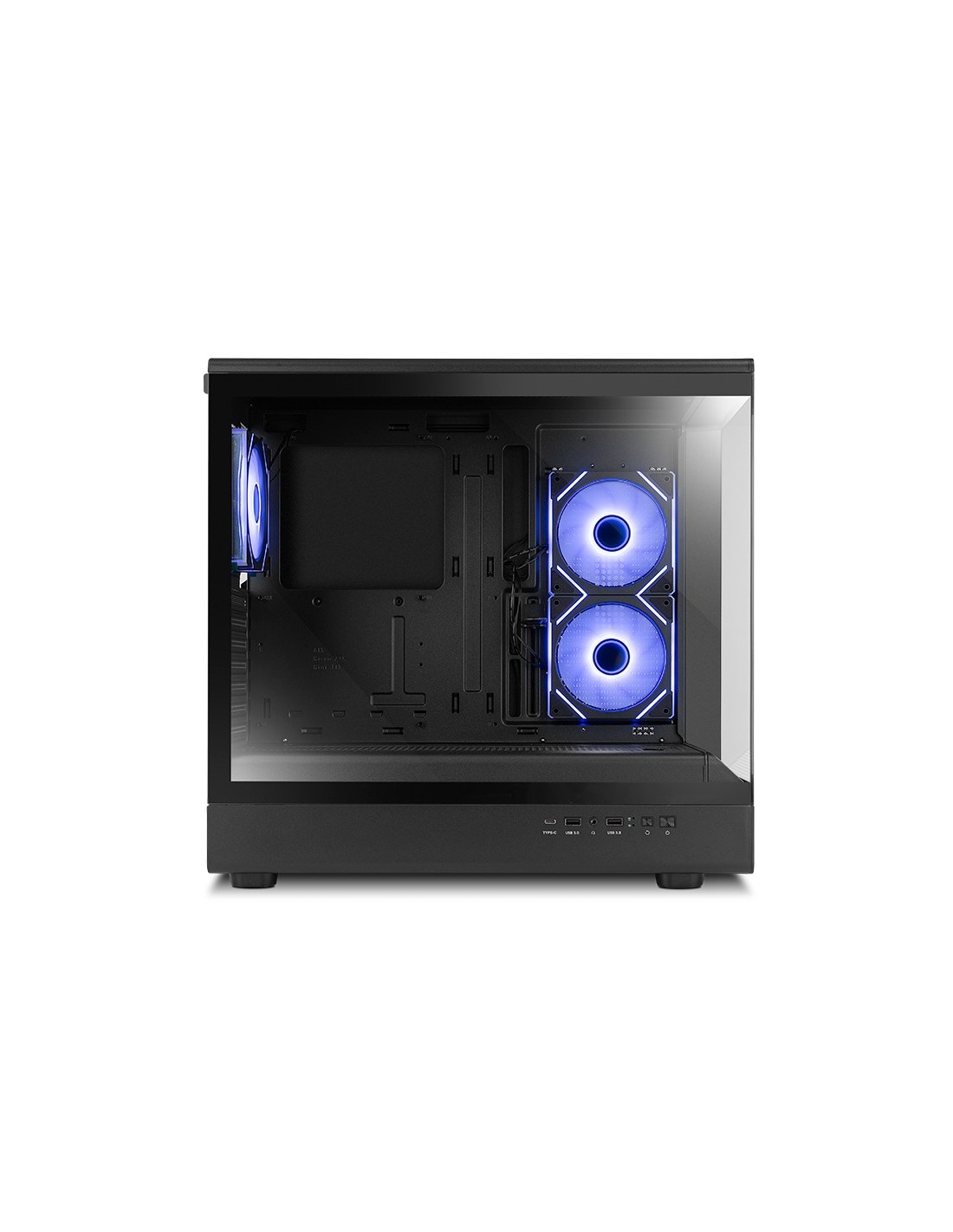 En su parte lateral inferior se encuentran los puertos dedicados a dos USB 3.0, un USB Tipo C de alta velocidad, así como las conexiones HD de audio y micrófono, lo que la hace una caja ideal para tener encima de tu escritorio o mesa gamer. Del mismo modo cuenta con una gestión de cableado de 21 mm.