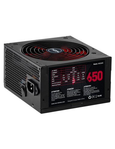 NOX NXS650. Potencia total: 650 W, Voltaje de entrada AC: 230 V, Frecuencia de entrada AC: 50 - 60 Hz. Alimentador de energía para tarjeta madre: 20+4 pin ATX, Tipo de cableado: No modular. Utilizar con: PC. Color del producto: Negro, Rojo, Tipo de enfriamiento: Activo, Diámetro de ventilador: 14 cm. Ancho: 150 mm, Profundidad: 160 mm, Altura: 86 mm