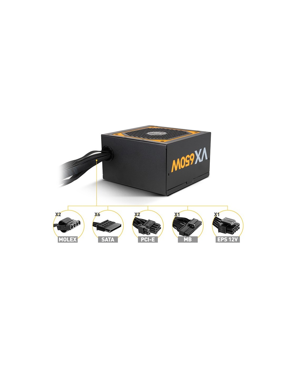 NOX Urano VX Bronze Edition. Potencia total: 650 W, Voltaje de entrada AC: 200 - 240 V, Frecuencia de entrada AC: 47 - 63 Hz. Alimentador de energía para tarjeta madre: 20+4 pin ATX, Longitud del cable de alimentación SATA: 600,750,900 mm, Longitud del cable de alimentación periférico (Molex): 600,750 mm. Utilizar con: PC, Factor de forma de fuente de alimentación (PSU): ATX, Certificación 80 PLUS: 80 PLUS Bronze. Color del producto: Negro, Naranja, Tipo de enfriamiento: Activo, Diámetro de ventilador: 12 cm. Certificados de conformidad: RoHS, Certificación: CE, WEEE, ERP 2013
