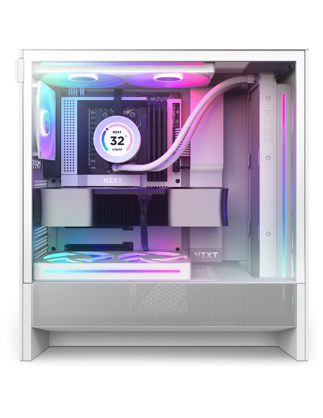 La NZXT H5 Flow RGB en su versión white (blanca) es una caja e-ATX de torre media compacta, diseñada para ofrecer un flujo de aire óptimo y una excelente refrigeración para la GPU. Su diseño incluye un recubrimiento de PSU perforado y paneles de malla ultrafina en la parte superior, frontal y lateral, lo que maximiza el flujo de aire mientras filtra el polvo.