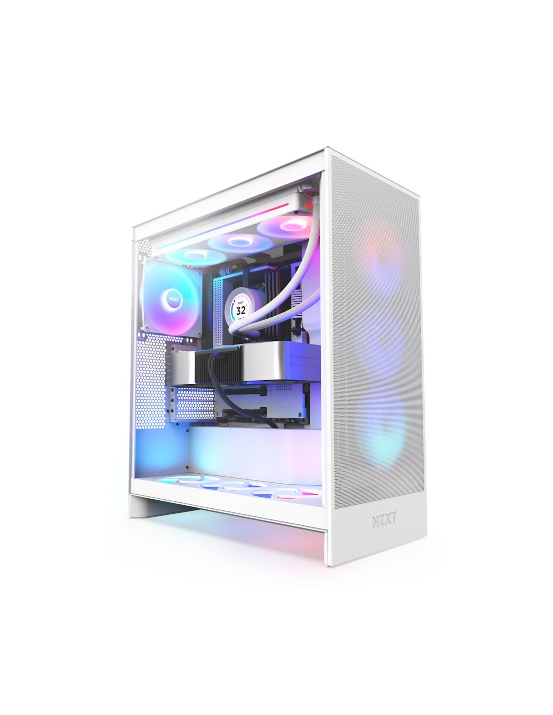NZXT H7 Flow RGB. Factor de forma: Midi Tower, Tipo: PC, Color del producto: Blanco. Ventiladores frontales instalados: 3x 120 mm, Diámetro de ventiladores frontales soportados: 120,140 mm, Diámetro de ventiladores traseros soportados: 120,140 mm. Tamaños de disco duro soportados: 2.5,3.5". Ancho: 244 mm, Profundidad: 468 mm, Altura: 544 mm