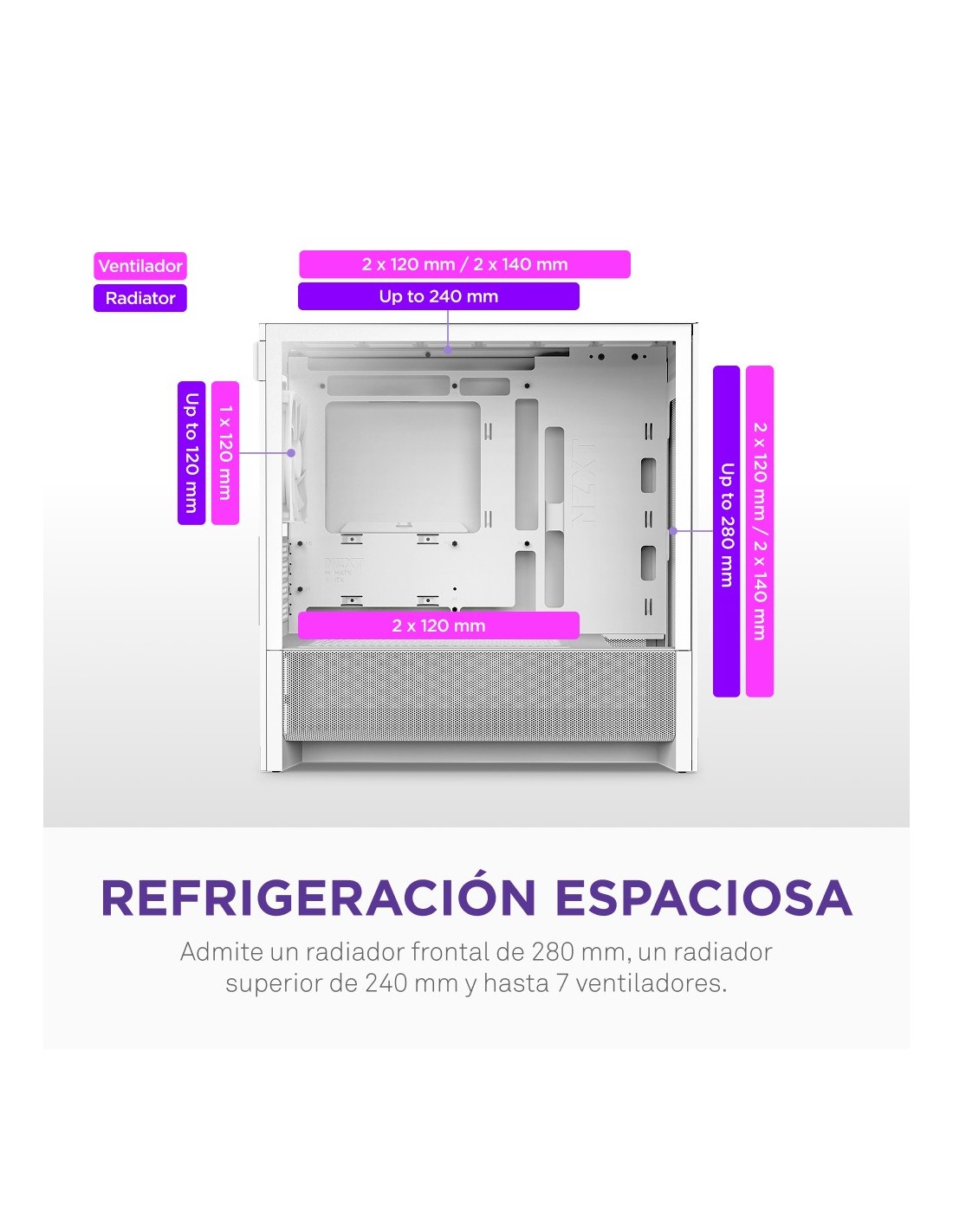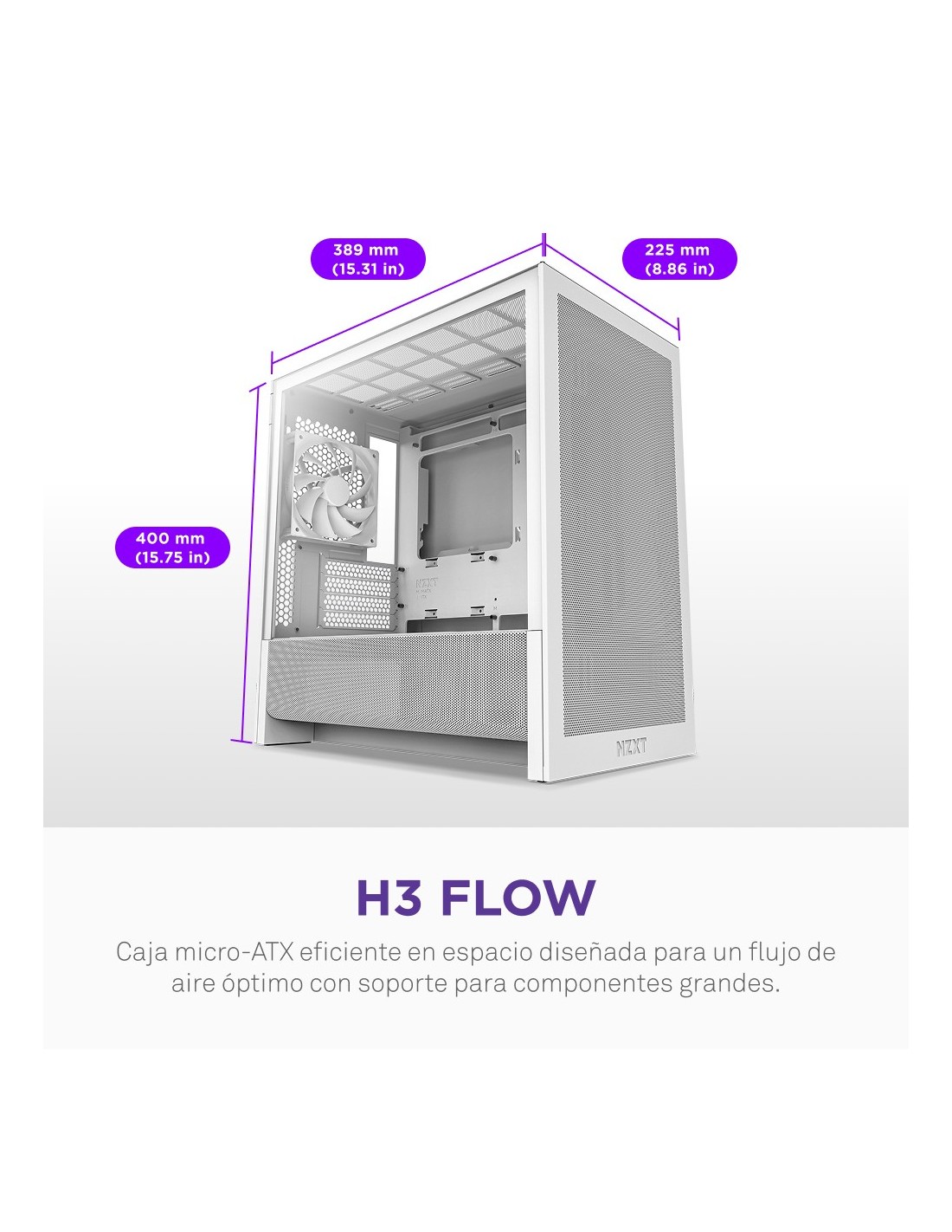 NZXT H9 H3 Flow. Factor de forma: Midi Tower, Tipo: PC, Color del producto: Blanco. Diámetro de ventiladores frontales soportados: 120,140 mm, Ventiladores traseros instalados: 1x 120 mm, Diámetro de ventiladores traseros soportados: 120 mm. Tamaños de disco duro soportados: 2.5,3.5". Ancho: 225 mm, Profundidad: 389 mm, Altura: 400 mm