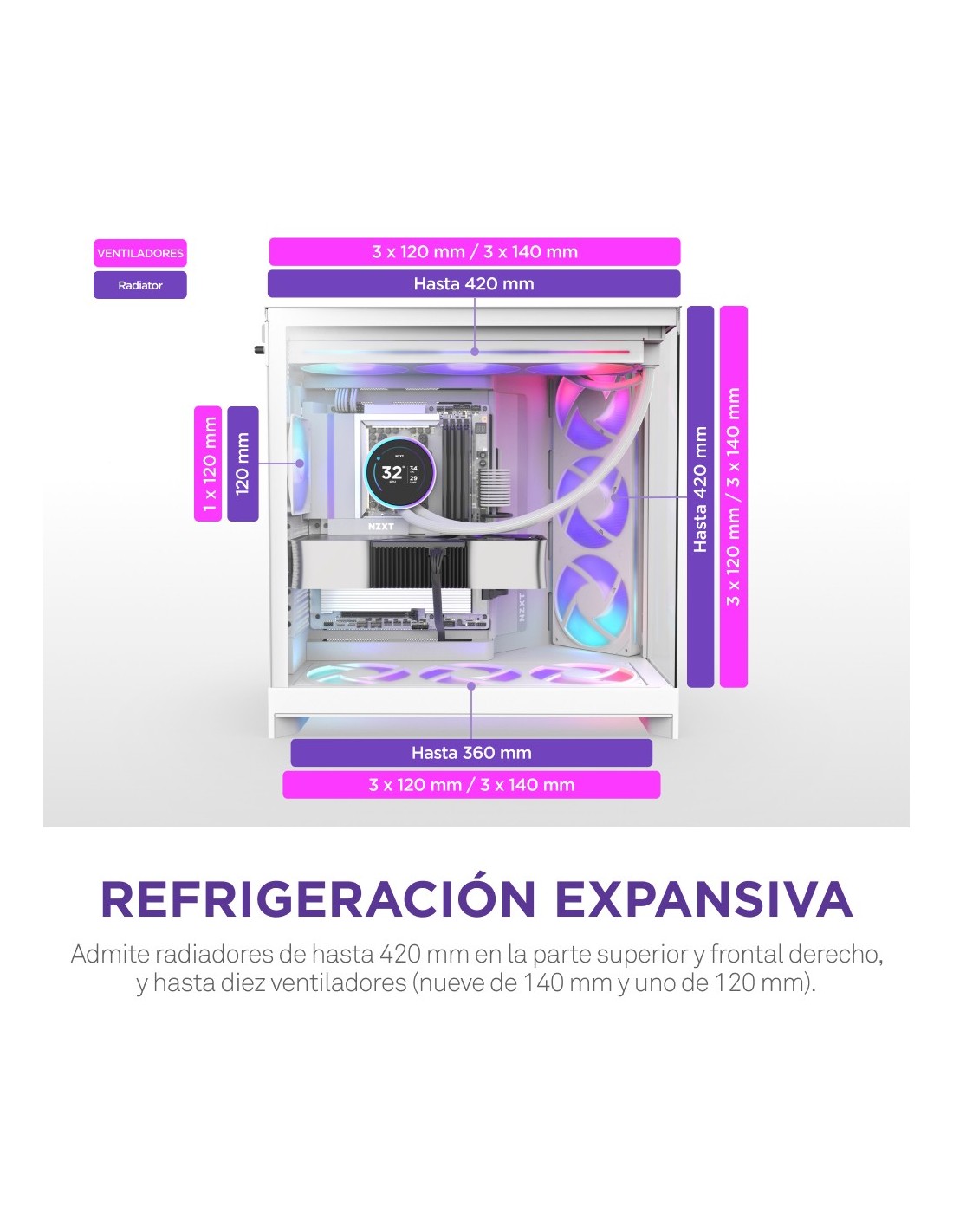 NZXT H9 Flow RGB. Factor de forma: Midi Tower, Tipo: PC, Color del producto: Blanco. Ventiladores frontales instalados: 3x 140 mm, Diámetro de ventiladores frontales soportados: 120,140 mm, Ventiladores traseros instalados: 1x 120 mm. Tamaños de disco duro soportados: 2.5,3.5". Ancho: 315 mm, Profundidad: 481 mm, Altura: 506 mm