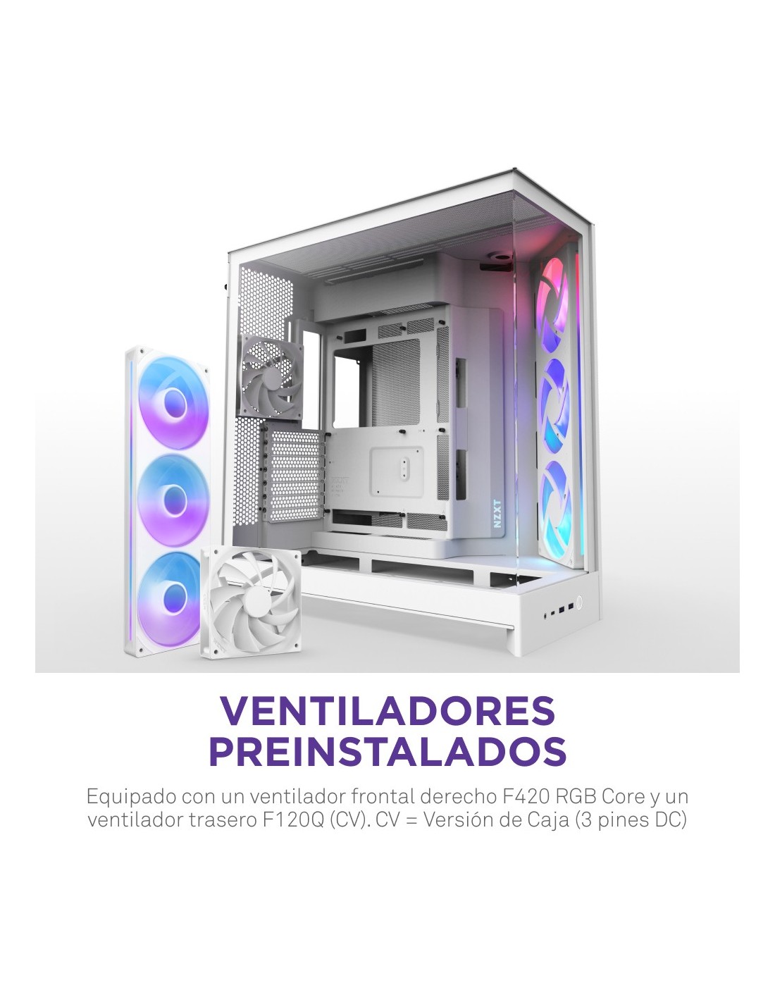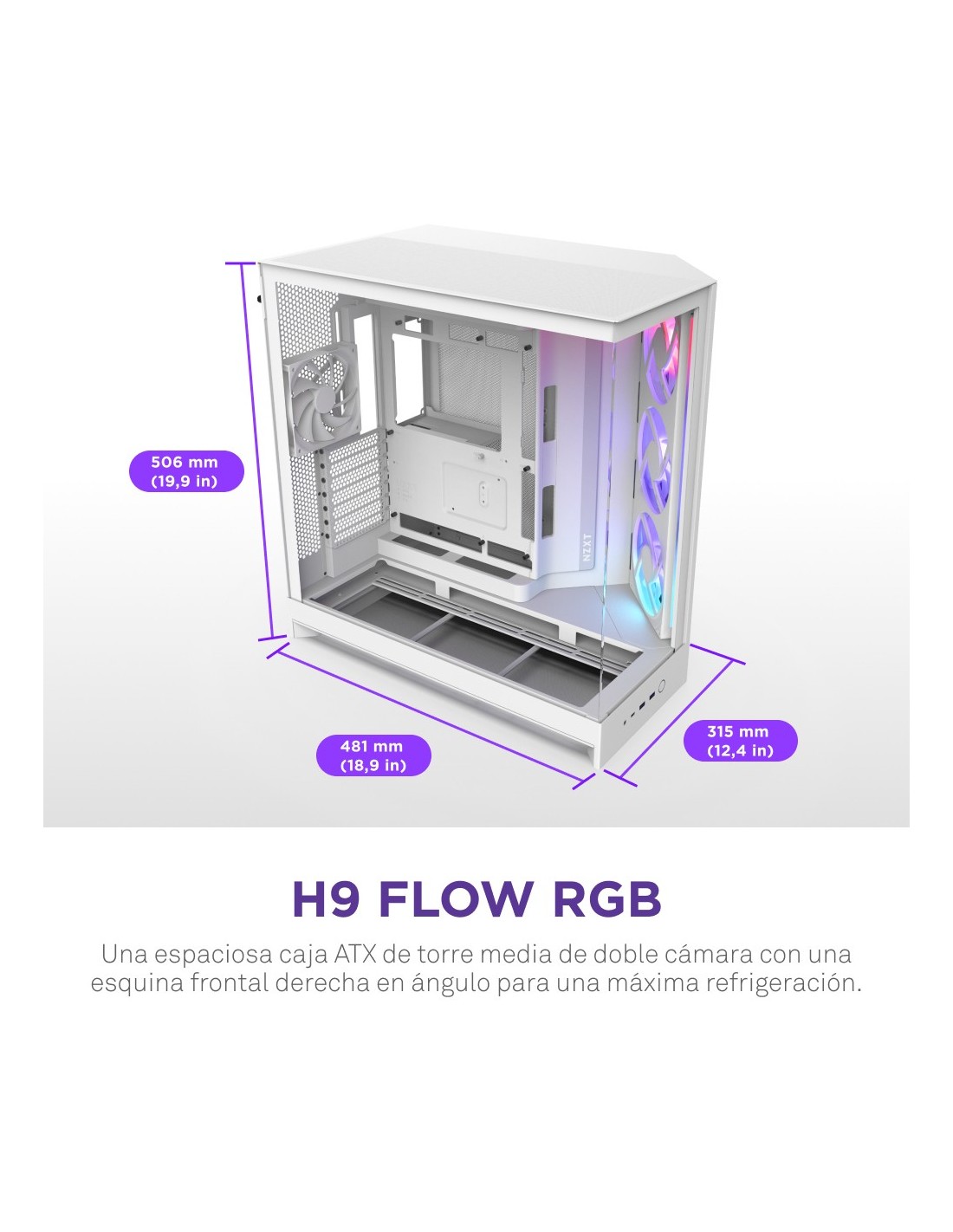 NZXT H9 Flow RGB. Factor de forma: Midi Tower, Tipo: PC, Color del producto: Blanco. Ventiladores frontales instalados: 3x 140 mm, Diámetro de ventiladores frontales soportados: 120,140 mm, Ventiladores traseros instalados: 1x 120 mm. Tamaños de disco duro soportados: 2.5,3.5". Ancho: 315 mm, Profundidad: 481 mm, Altura: 506 mm
