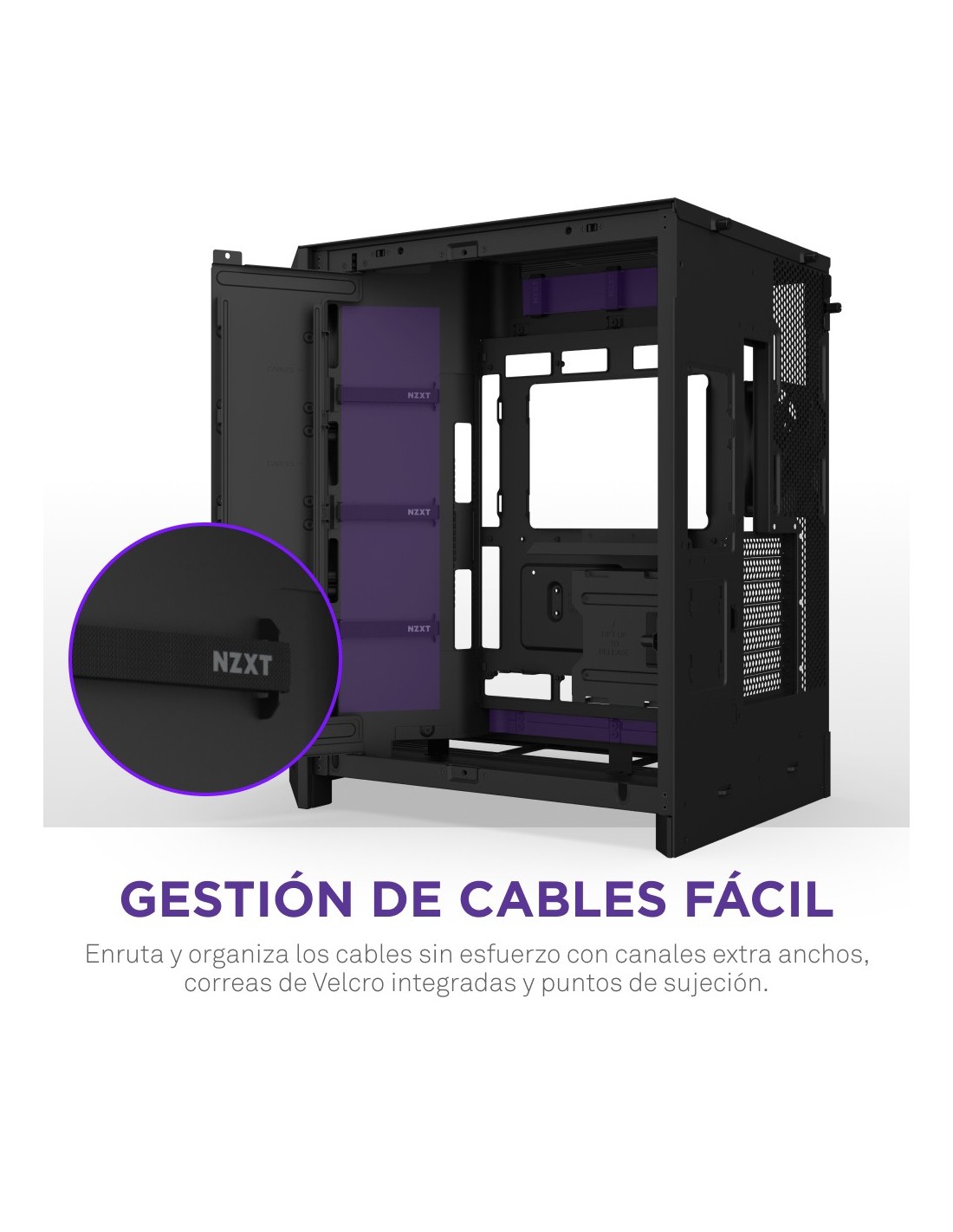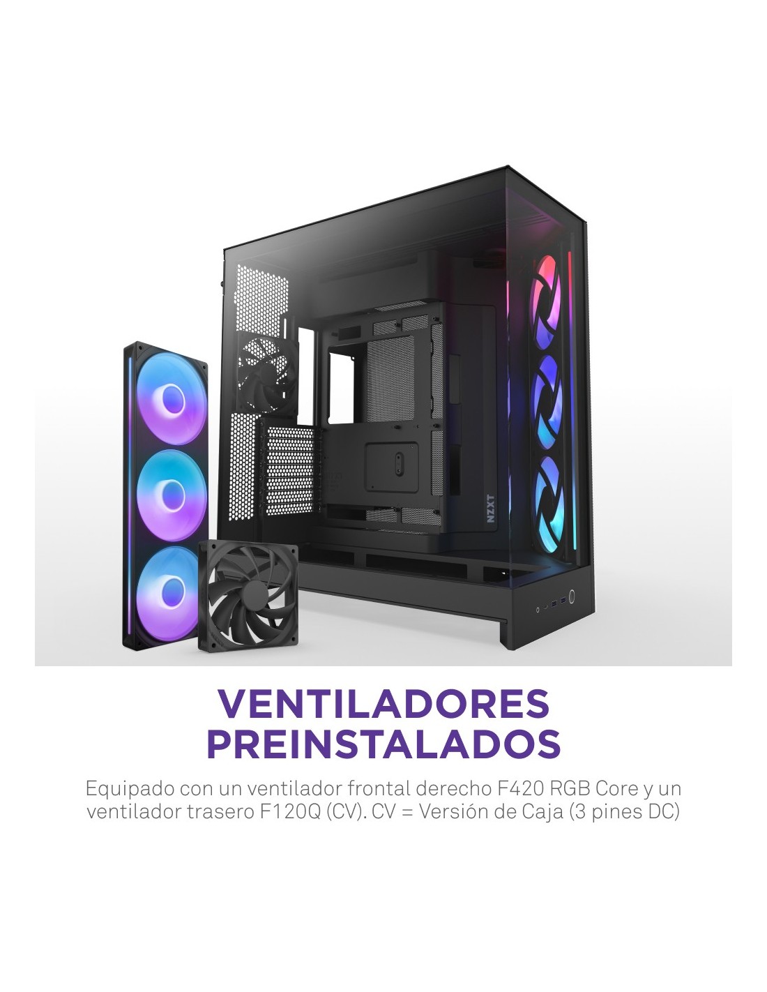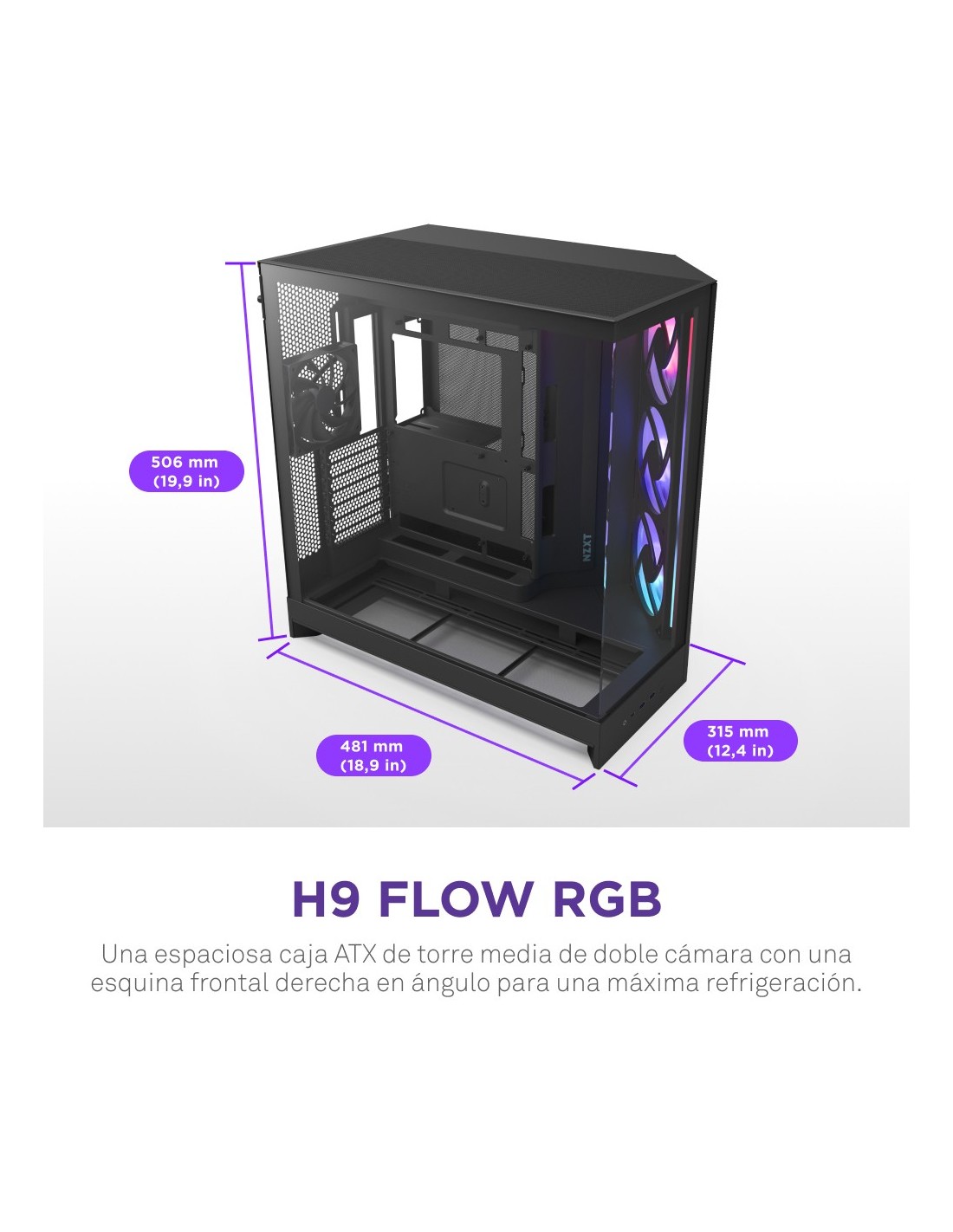 NZXT H9 Flow RGB. Factor de forma: Midi Tower, Tipo: PC, Color del producto: Negro. Ventiladores frontales instalados: 3x 140 mm, Diámetro de ventiladores frontales soportados: 120,140 mm, Ventiladores traseros instalados: 1x 120 mm. Tamaños de disco duro soportados: 2.5,3.5". Ancho: 315 mm, Profundidad: 481 mm, Altura: 506 mm
