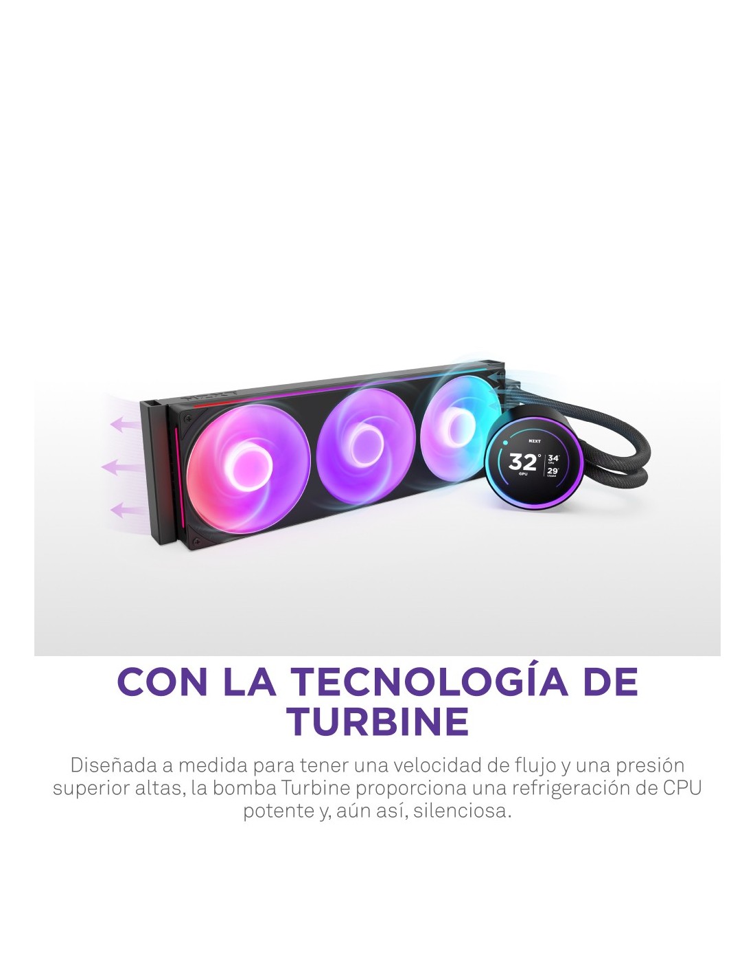 NZXT Kraken Elite 360 RGB. Tipo: Sistema de refrigeración líquida todo en uno, Diámetro de ventilador: 12 cm, Presión máxima de aire: 3,3 mmH2O. Color del producto: Negro