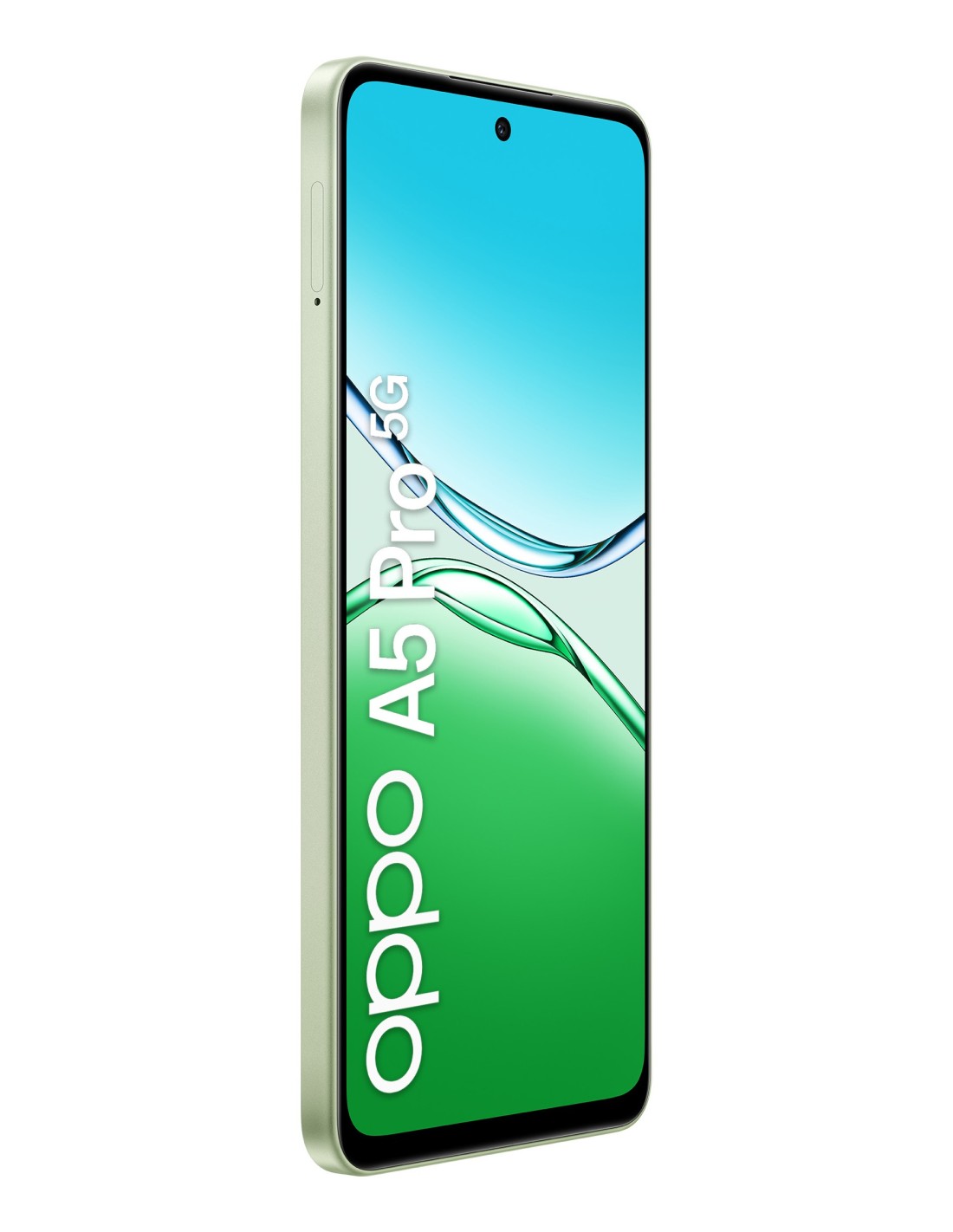 OPPO A5 Pro 5G. Diagonal de la pantalla: 16,9 cm (6.67"), Resolución de la pantalla: 1604 x 720 Pixeles. Frecuencia del procesador: 2,4 GHz, Familia de procesador: MediaTek Dimensity, Modelo del procesador: 6300. Capacidad de RAM: 8 GB, Tipo de RAM: LPDDR4X, Capacidad de almacenamiento interno: 256 GB. Resolución de la cámara trasera (numérica): 50 MP, Tipo de cámara trasera: Cámara doble. Capacidad de la tarjeta SIM: SIM doble. Sistema operativo instalado: Android 15. Capacidad de batería: 5800 mAh. Color del producto: Verde, Oliva. Peso: 194 g