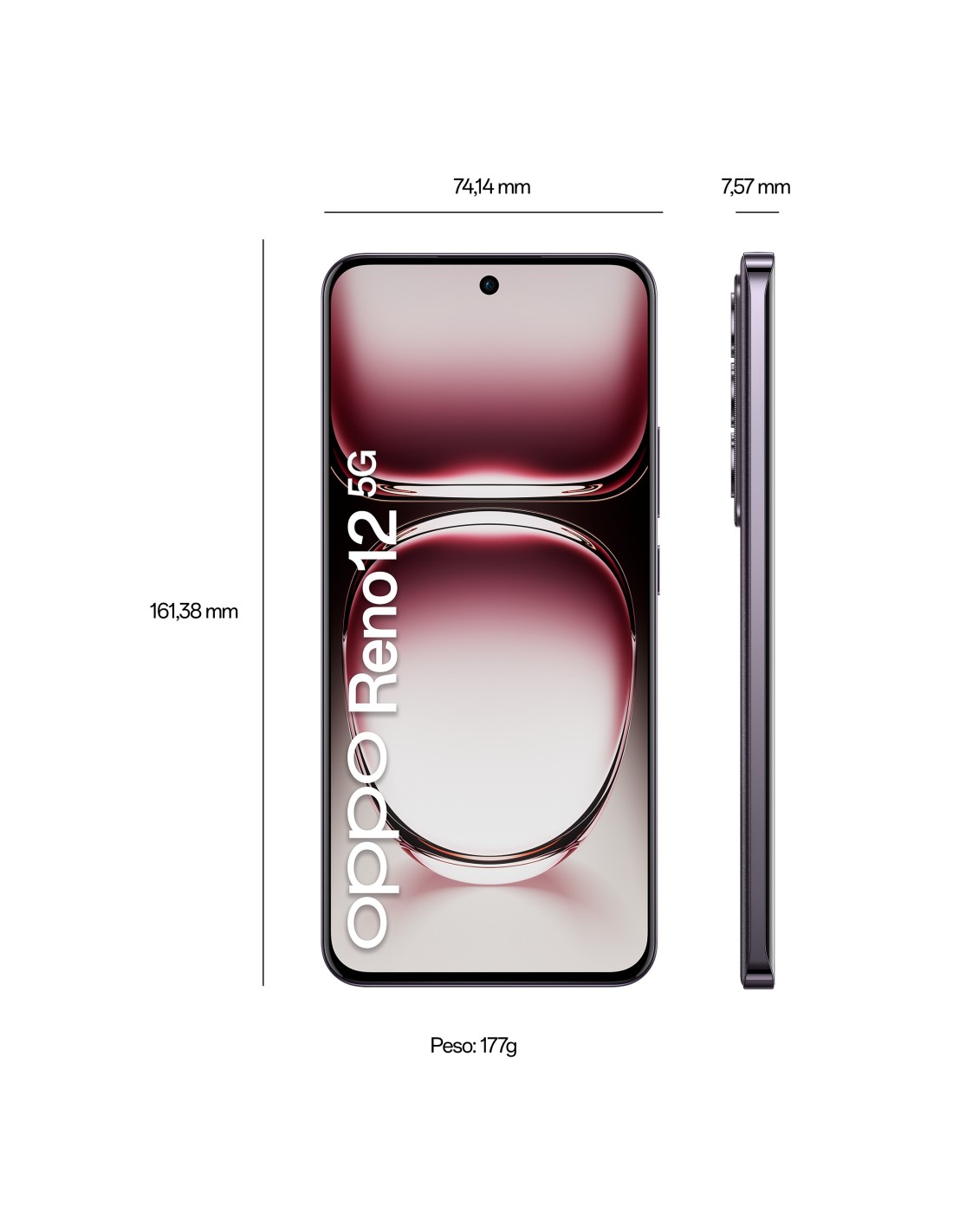 OPPO Reno12 5G. Diagonal de la pantalla: 17 cm (6.7"), Resolución de la pantalla: 2412 x 1080 Pixeles. Frecuencia del procesador: 2,5 GHz, Familia de procesador: MediaTek, Modelo del procesador: 7300. Capacidad de RAM: 12 GB, Capacidad de almacenamiento interno: 256 GB. Resolución de la cámara trasera (numérica): 50 MP, Tipo de cámara trasera: Triple cámara. Capacidad de la tarjeta SIM: SIM doble. Sistema operativo instalado: Android 14. Capacidad de batería: 5000 mAh. Color del producto: Negro. Peso: 177 g