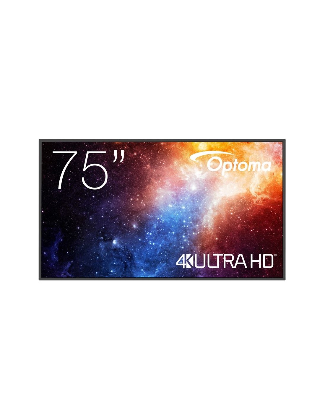 Optoma N3751K. Diseño de producto: Pantalla plana para señalización digital. Diagonal de la pantalla: 190,5 cm (75"), Tecnología de visualización: LED, Resolución de la pantalla: 3840 x 2160 Pixeles, Brillo de pantalla: 450 cd / m², Tipo HD: 4K Ultra HD. Wifi. Horas de funcionamiento (horas/días): 24/7. Sistema operativo instalado: Android 11. Color del producto: Negro