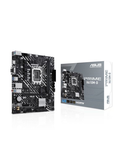 ASUS PRIME H610M-D. Fabricante de procesador: Intel, Socket de procesador: LGA 1700, Procesador compatible: Intel® Celeron®, Intel® Pentium® Gold, Intel® Core™ i3, Intel® Core™ i5, Intel® Core™.... tipos de memoria compatibles: DDR5-SDRAM, Memoria interna máxima: 96 GB, Tipo de ranuras de memoria: DIMM. Interfaces de disco de almacenamiento soportados: M.2, SATA III, Tipos de unidades de almacenamiento admitidas: HDD & SSD. Tipo de interfaz ethernet: Gigabit Ethernet. Componente para: PC, Factor de forma: micro ATX, Familia del chipset: Intel