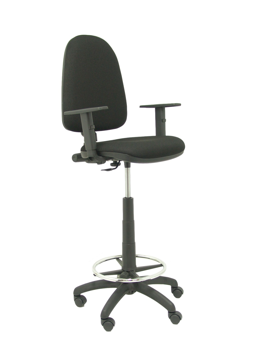 Taburete ergonómico con mecanismo de contacto permanente, regulable en altura, brazos regulables de serie y aro reposapiés.