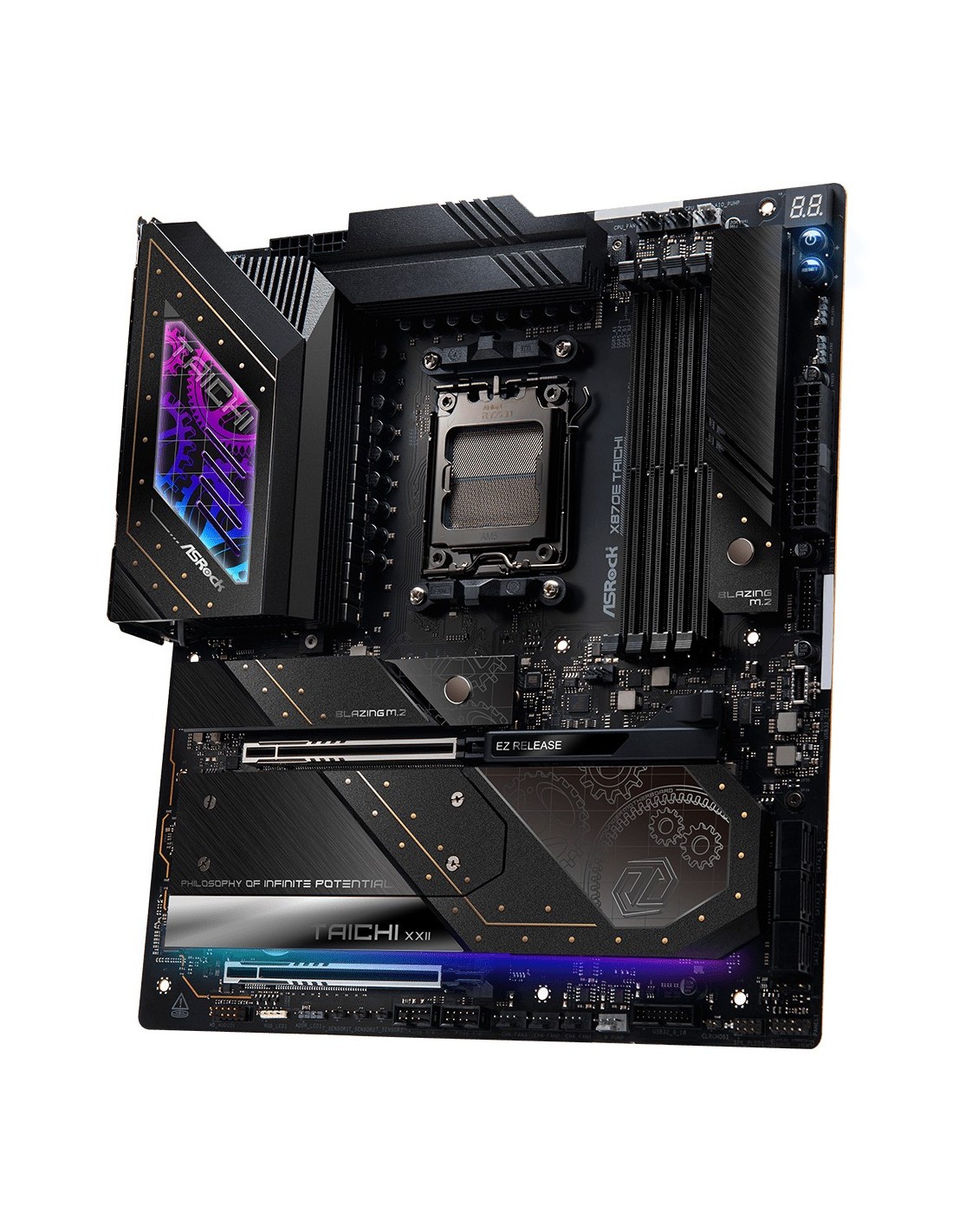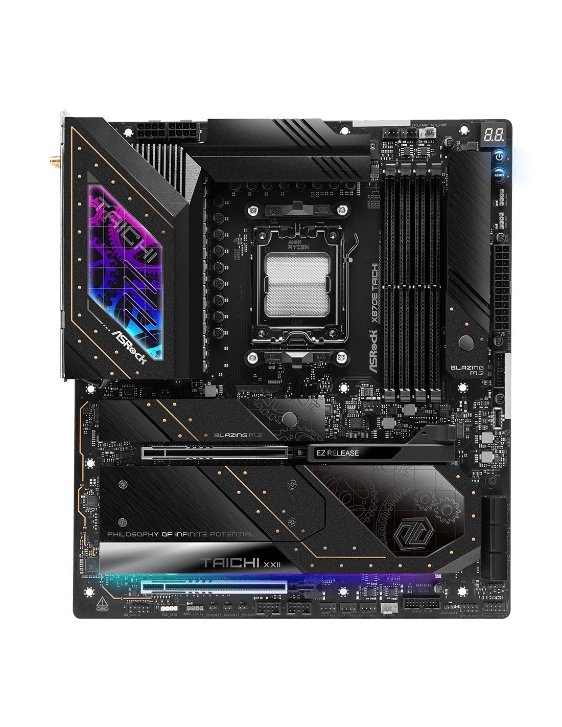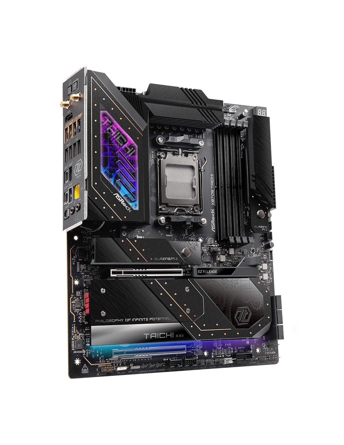 Asrock X870E Taichi. Fabricante de procesador: AMD, Socket de procesador: Zócalo AM5, Procesador compatible: AMD Ryzen 7000 Series, AMD Ryzen 8000 Series, AMD Ryzen 9000 Series. tipos de memoria compatibles: DDR5-SDRAM, Memoria interna máxima: 256 GB, Tipo de ranuras de memoria: DIMM. Interfaces de disco de almacenamiento soportados: M.2, SATA III, Tipos de unidades de almacenamiento admitidas: HDD & SSD, Niveles RAID: 0, 1, 10. Tipo de interfaz ethernet: 2.5 Gigabit Ethernet, 5 Gigabit Ethernet, Ethernet rápido, Gigabit Ethernet, Controlador LAN: Realtek RTL8126, Estándar Wi-Fi: Wi-Fi 7 (802.11be). Componente para: PC, Factor de forma: ATX extendida, Familia del chipset: AMD