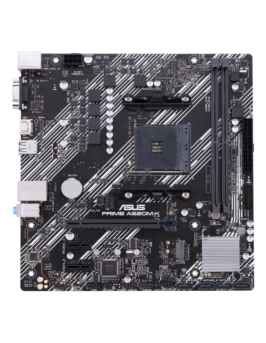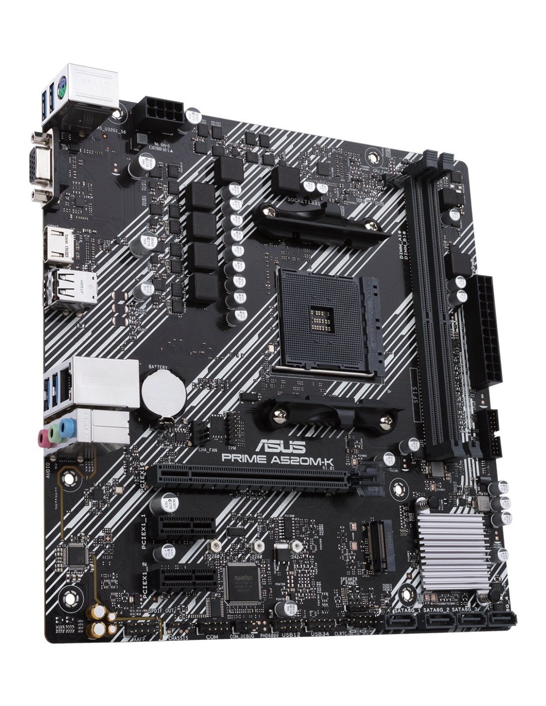 ASUS PRIME A520M-K. Fabricante de procesador: AMD, Socket de procesador: Zócalo AM4, Procesador compatible: AMD Ryzen™ 3, AMD Ryzen™ 5, AMD Ryzen™ 7. tipos de memoria compatibles: DDR4-SDRAM, Memoria interna máxima: 64 GB, Tipo de ranuras de memoria: DIMM. Interfaces de disco de almacenamiento soportados: M.2, SATA III, Tipos de unidades de almacenamiento admitidas: HDD & SSD, Niveles RAID: 0, 1, 10. Conector USB: USB tipo A. Tipo de interfaz ethernet: Gigabit Ethernet, Controlador LAN: Realtek RTL8111H