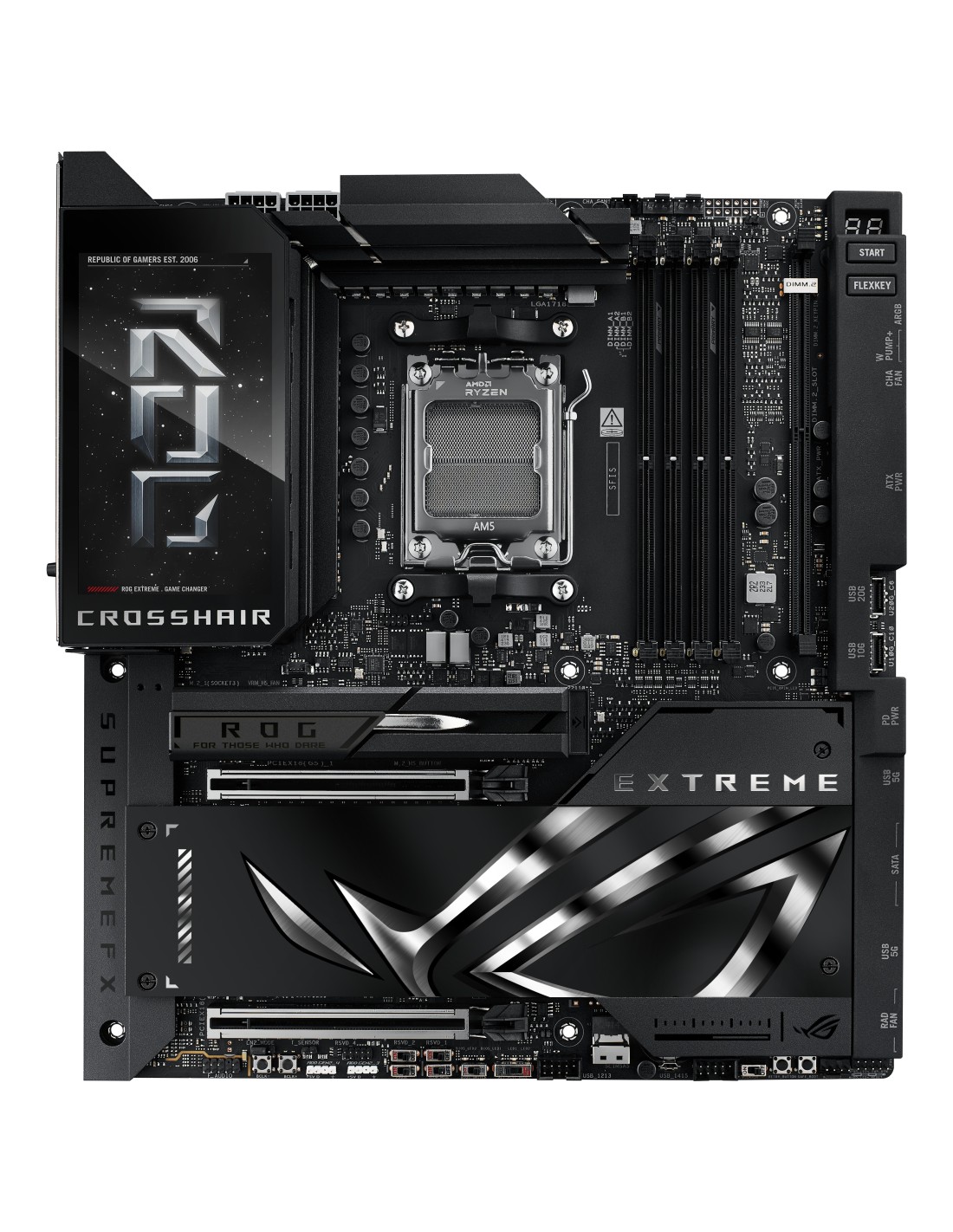 ASUS ROG CROSSHAIR X870E EXTREME. Fabricante de procesador: AMD, Socket de procesador: Zócalo AM5, Procesador compatible: AMD Ryzen 7000 Series, AMD Ryzen 8000 Series, AMD Ryzen 9000 Series. tipos de memoria compatibles: DDR5-SDRAM, Memoria interna máxima: 256 GB, Tipo de ranuras de memoria: DIMM. Interfaces de disco de almacenamiento soportados: M.2, SATA III, SlimSAS, Tipos de unidades de almacenamiento admitidas: HDD & SSD, Niveles RAID: 0, 1, 5, 10. Tipo de interfaz ethernet: 5 Gigabit Ethernet, 10 Gigabit Ethernet, Estándar Wi-Fi: Wi-Fi 7 (802.11be), Wi-Fi estándares: Wi-Fi 7 (802.11be). Componente para: PC, Factor de forma: ATX extendida, Familia del chipset: AMD