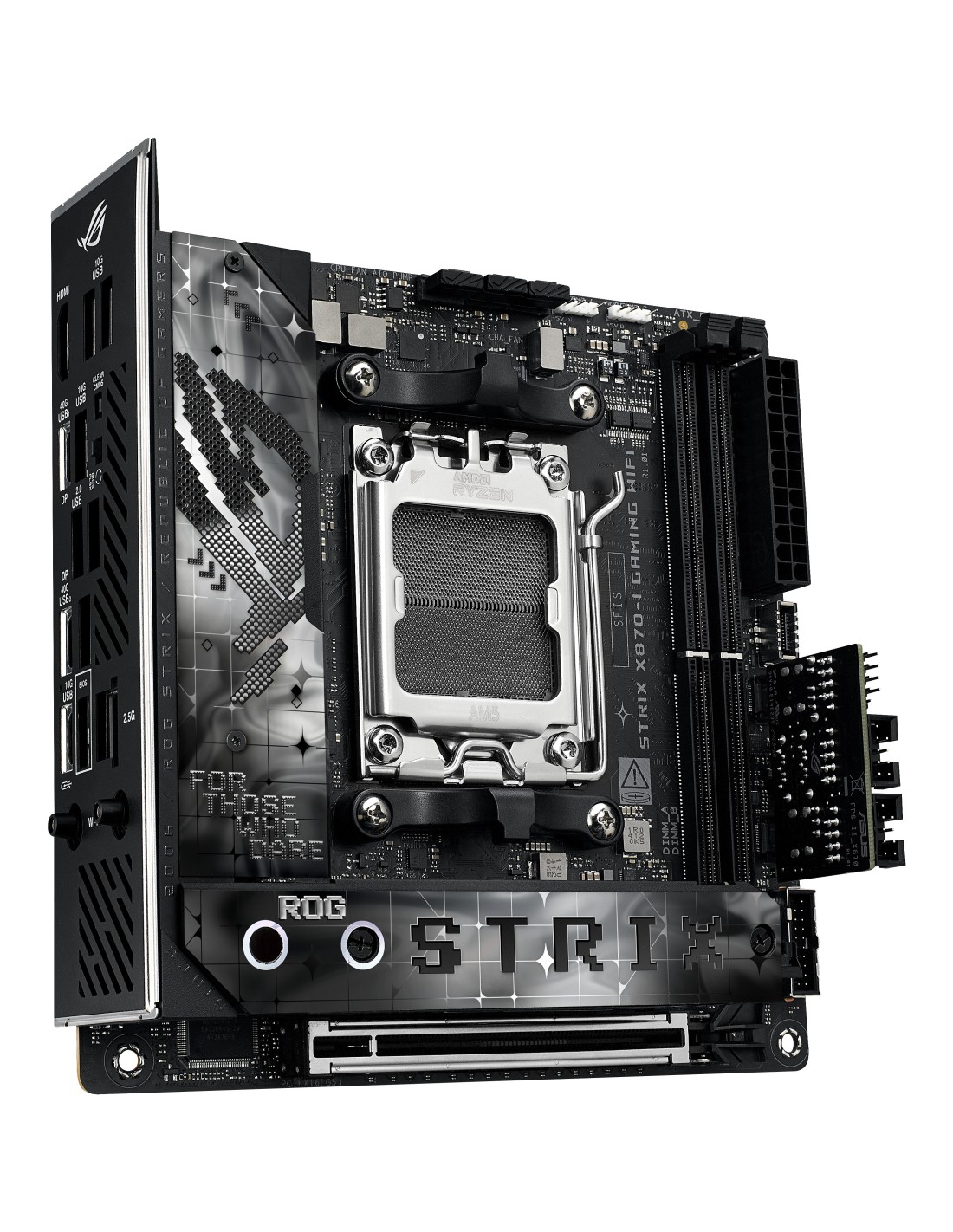 ASUS ROG STRIX X870-I GAMING WIFI. Fabricante de procesador: AMD, Socket de procesador: Zócalo AM5, Procesador compatible: AMD Ryzen 7000 Series, AMD Ryzen 8000 Series, AMD Ryzen 9000 Series. tipos de memoria compatibles: DDR5-SDRAM, Memoria interna máxima: 96 GB, Tipo de ranuras de memoria: DIMM. Interfaces de disco de almacenamiento soportados: M.2, SATA III, Tipos de unidades de almacenamiento admitidas: HDD & SSD, Niveles RAID: 0, 1, 10. Conector USB: USB tipo A, USB Tipo C. Tipo de interfaz ethernet: 2.5 Gigabit Ethernet, Ethernet rápido, Gigabit Ethernet, Estándar Wi-Fi: Wi-Fi 7 (802.11be), Wi-Fi estándares: Wi-Fi 7 (802.11be)