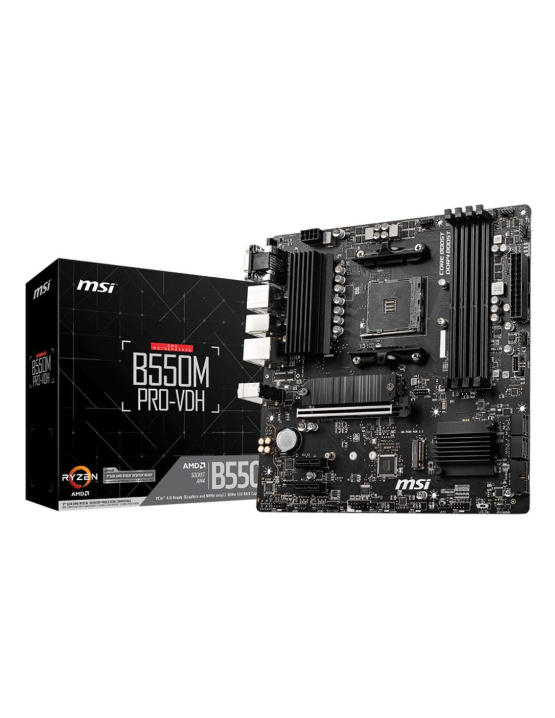 MSI B550M PRO-VDH. Fabricante de procesador: AMD, Socket de procesador: Zócalo AM4, Procesador compatible: AMD Ryzen 3000 Series. tipos de memoria compatibles: DDR4-SDRAM, Memoria interna máxima: 128 GB, Tipo de ranuras de memoria: DIMM. Interfaces de disco de almacenamiento soportados: SATA III, Tipos de unidades de almacenamiento admitidas: HDD & SSD, Niveles RAID: 0, 1, 10. Máxima resolución: 4096 x 2160 Pixeles. Tipo de interfaz ethernet: Gigabit Ethernet, Controlador LAN: Realtek 8111HN