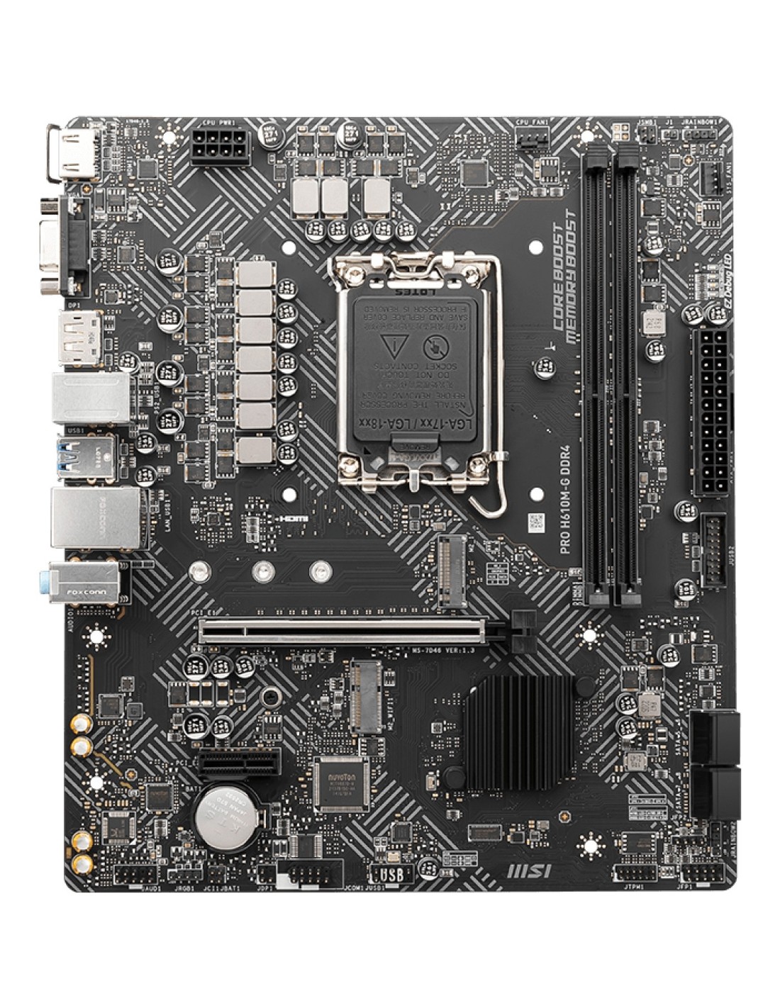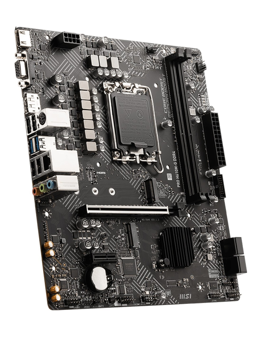 MSI PRO H610M-G DDR4. Fabricante de procesador: Intel, Socket de procesador: LGA 1700, Procesador compatible: Intel® Core™ i9. tipos de memoria compatibles: DDR4-SDRAM, Memoria interna máxima: 64 GB, Tipo de ranuras de memoria: DIMM. Interfaces de disco de almacenamiento soportados: M.2, SATA III, Tipos de unidades de almacenamiento admitidas: SSD. Tipo de interfaz ethernet: Gigabit Ethernet. Componente para: PC, Factor de forma: micro ATX, Familia del chipset: Intel