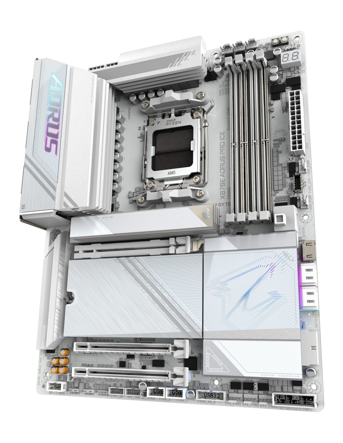 GIGABYTE X870E AORUS PRO ICE Placa Base - Soporta CPUs AMD Ryzen 9000, 16+2+2 Fases VRM Digital, hasta 8000MHz DDR5 (OC), 3xPCIe 5.0 + 1xPCIe 4.0, Wi-Fi 7, 2.5GbE LAN, USB 4. Fabricante de procesador: AMD, Socket de procesador: Zócalo AM5, Procesador compatible: AMD Ryzen 7000 Series, AMD Ryzen 8000 Series, AMD Ryzen 9000 Series. tipos de memoria compatibles: DDR5-SDRAM, Memoria interna máxima: 256 GB, Tipo de ranuras de memoria: DIMM. Interfaces de disco de almacenamiento soportados: M.2, SATA III, Tipos de unidades de almacenamiento admitidas: HDD & SSD, Niveles RAID: 0, 1, 10. Tipo de interfaz ethernet: 2.5 Gigabit Ethernet, Controlador LAN: Realtek RTL8125, Estándar Wi-Fi: Wi-Fi 7 (802.11be). Componente para: PC, Factor de forma: ATX, Familia del chipset: AMD