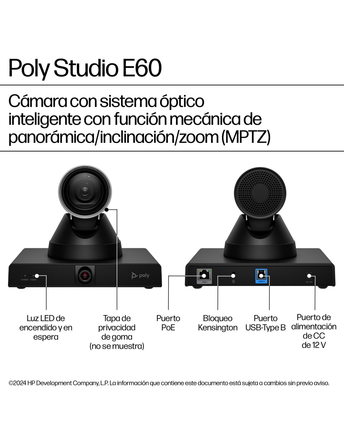 Poly Cámara inteligente Studio E60 4K con zoom óptico de 12 aumentos y MPTZ, 8 MP, 4K Ultra HD, 3840 x 2160 Pixeles, 60 pps, 12x, Negro