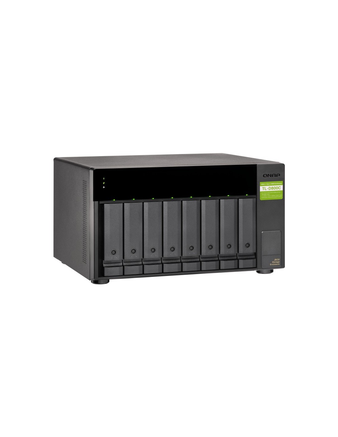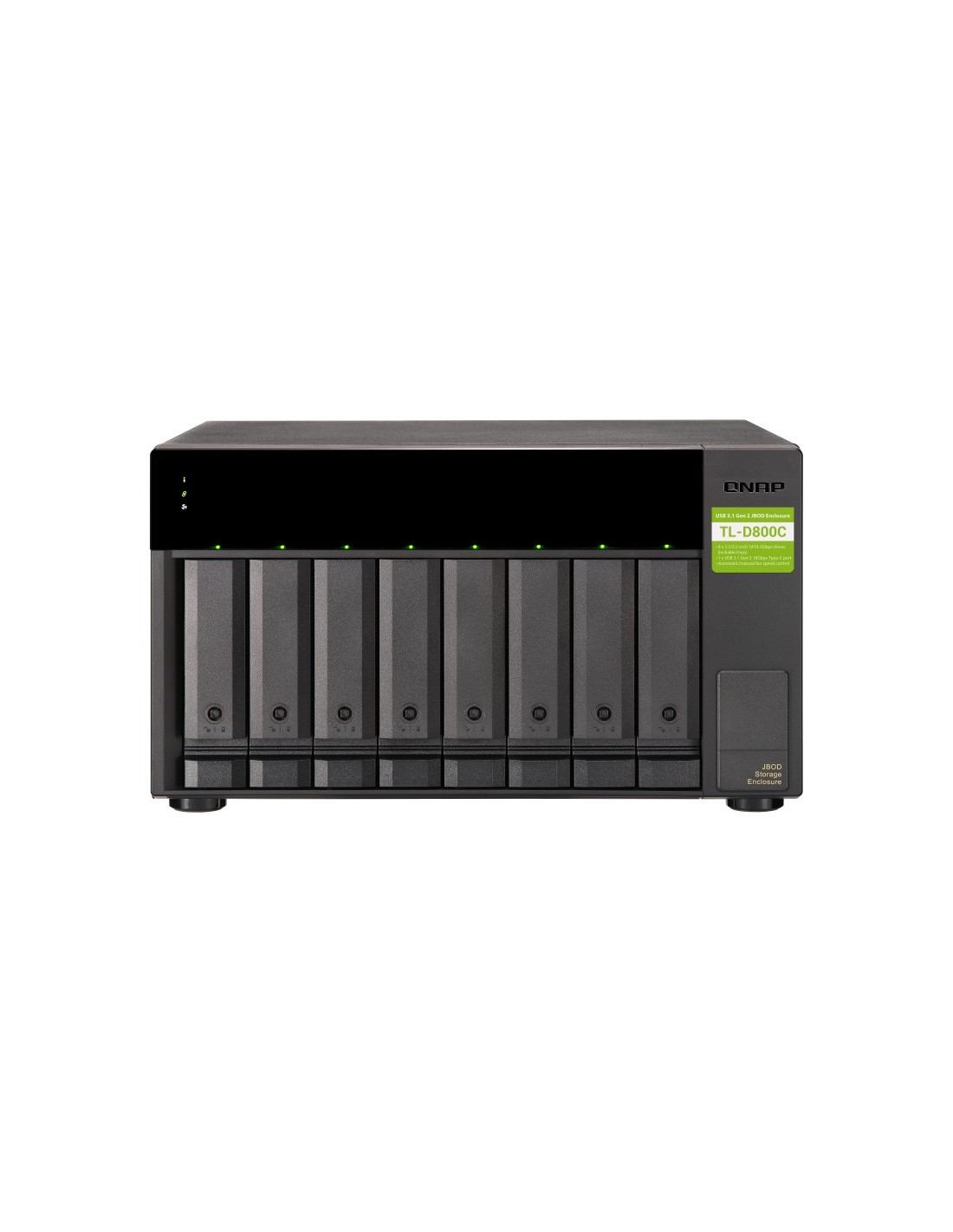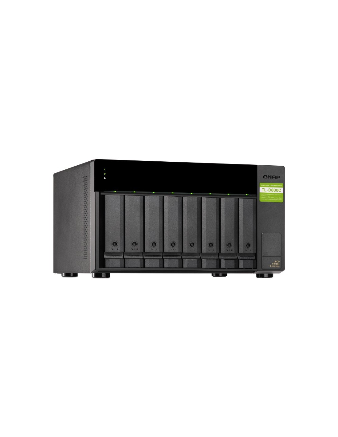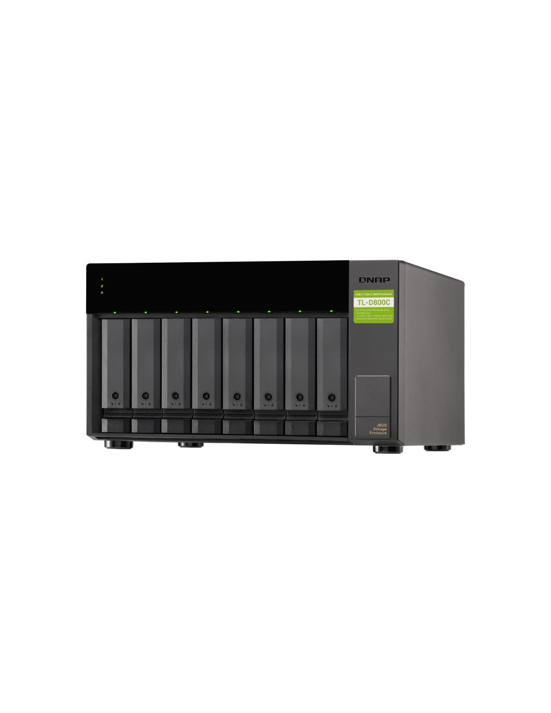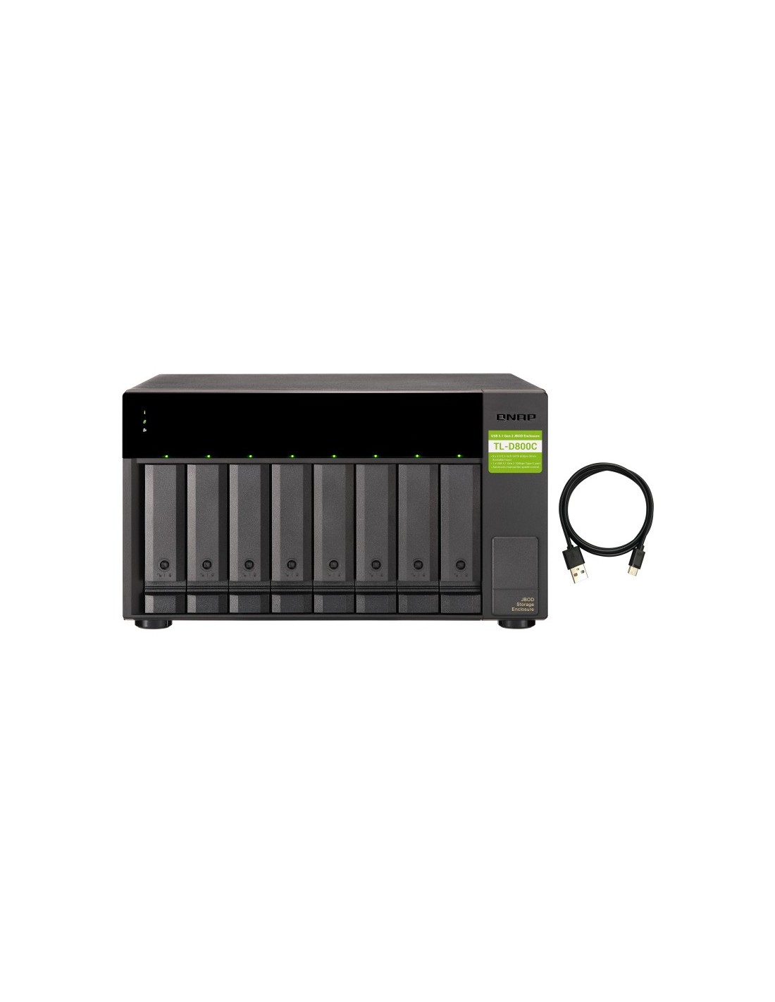QNAP TL-D800C. Tipo de producto: Carcasa de disco duro/SSD. Número de unidades de almacenamiento compatibles: 8, Tamaño de la unidad de almacenamiento: 2.5/3.5", Interfaces de disco de almacenamiento soportados: Serial ATA II, Serial ATA III. Velocidad de transferencia de datos: 6 Gbit/s. Hot-swap. Color del producto: Negro, Gris. Conector USB: USB Tipo C