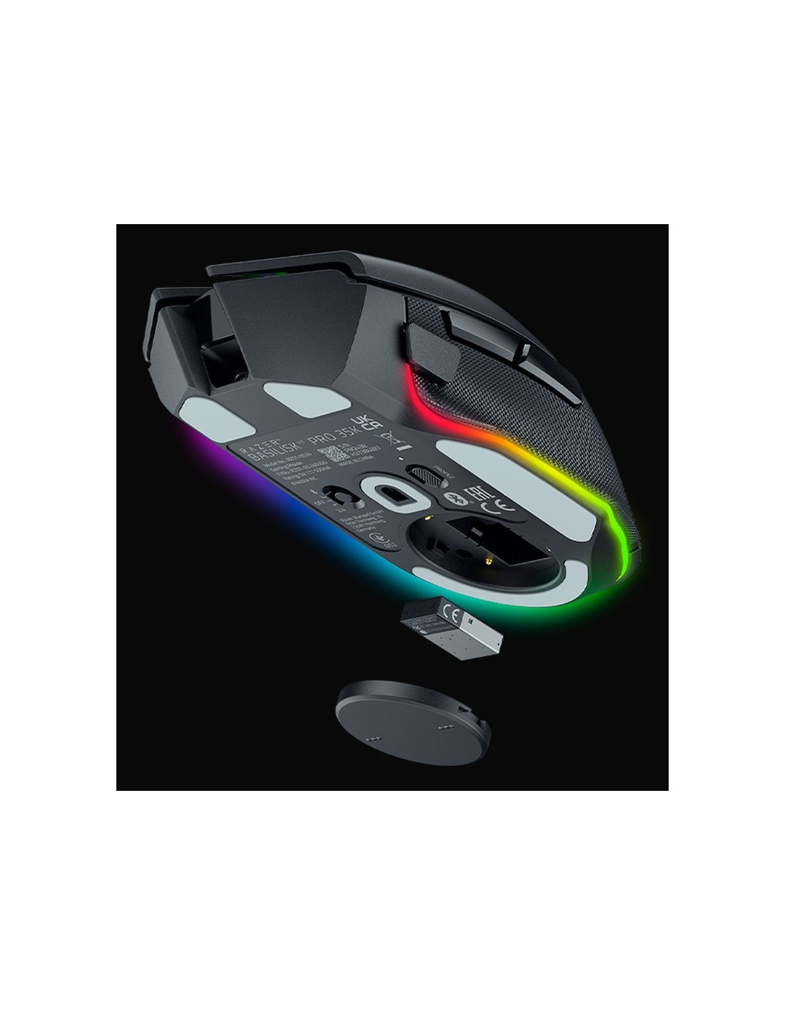 Razer Basilisk V3 Pro 35K. Factor de forma: mano derecha. Tecnología de detección de movimientos: Óptico, Interfaz del dispositivo: RF Wireless + Bluetooth + USB Type-A, Resolución de movimiento: 35000 DPI, Tipo de botones: Botones presionados, Tipo de desplazamiento: Rueda, Aceleración (máx.): 70 G. Iluminación de color: Multi. Fuente de energía: Baterías/Cable. Color del producto: Negro