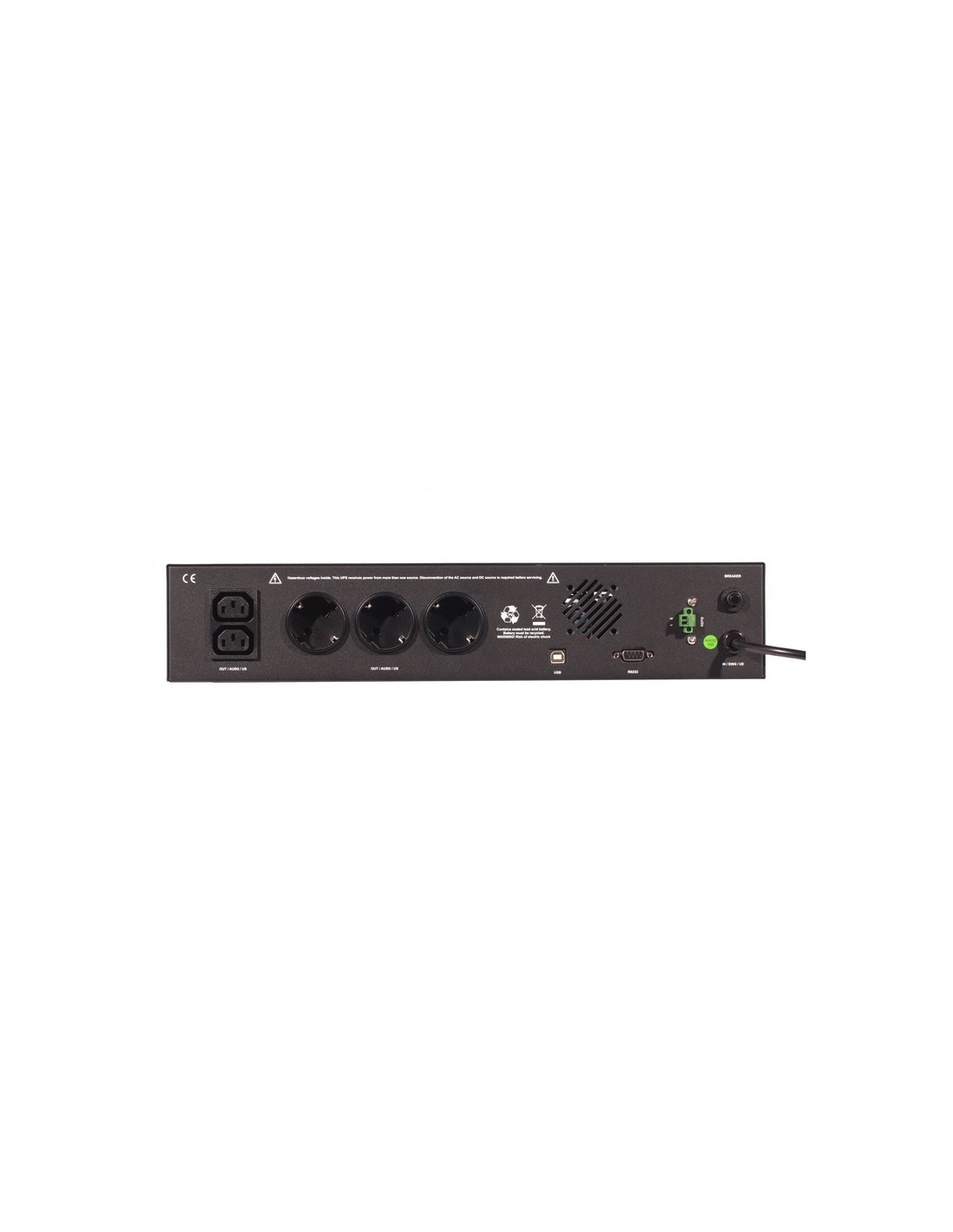 Riello IDR 1200. Capacidad de potencia de salida (VA): 1,2 kVA, Potencia de salida: 720 W, Voltaje de entrada de operación (min): 220 V. Cantidad de salidas AC: 5 salidas AC. Tiempo típico de respaldo a carga completa: 5 min, Tiempo típico de respaldo a media carga: 12 min. Factor de forma: Montaje en rack o Montaje en bastidor, Color del producto: Negro. Ancho: 438 mm, Profundidad: 300 mm, Altura: 87 mm
