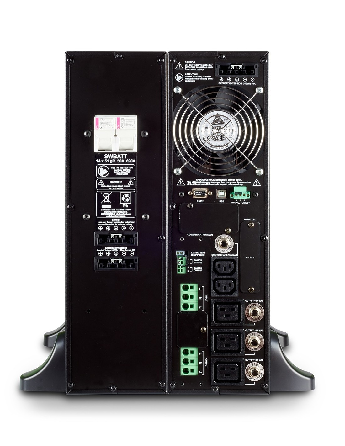 Instalación simplificada - Puede instalarse sobre el suelo (versión tower) o en armarios de montaje en racks (versión rack) el panel sinóptico puede girarse (utilizando la llave suministrada); - Bajo nivel de ruido (<48 dBA): puede instalarse en cualquier entorno gracias a su inversor PWM de conmutación de alta frecuencia y a su ventilador de control digital y dependiente de la carga; - Opción de bypass externo para mantenimiento con conmutación sin interrupción; - Funcionamiento garantizado hasta 40 °C (los componentes han sido diseñados para altas temperaturas y quedan por tanto sujetos a menor estrés a temperaturas normales) - Bases de salida IEC incorporadas con protección térmica.
