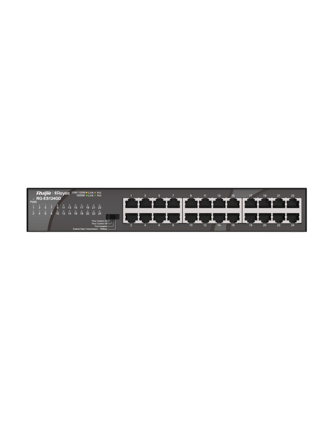 Ruijie Networks RG-ES124GD. Tipo de interruptor: No administrado. Puertos tipo básico de conmutación RJ-45 Ethernet: Gigabit Ethernet (10/100/1000), Cantidad de puertos básicos de conmutación RJ-45 Ethernet: 24. Tabla de direcciones MAC: 8000 entradas, Capacidad de conmutación: 48 Gbit/s