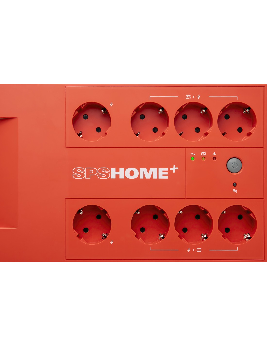 Salicru SPS 650 HOME+. Topología UPS: Línea interactiva, Capacidad de potencia de salida (VA): 0,65 kVA, Potencia de salida: 360 W. Tipo de salida AC: Tipo F, Conector: Tipo F, Cantidad de salidas AC: 8 salidas AC. Tecnología de batería: Plomo-Calcio (Pb-Ca), Tiempo de recarga (90%): 8 h. Factor de forma: Compacto, Color del producto: Rojo, Tipo de control: Botones. Certificación: EN-IEC 62040-1 EN 62040-2 EN 62040-3 ISO 9001, ISO 14001, ISO 45001