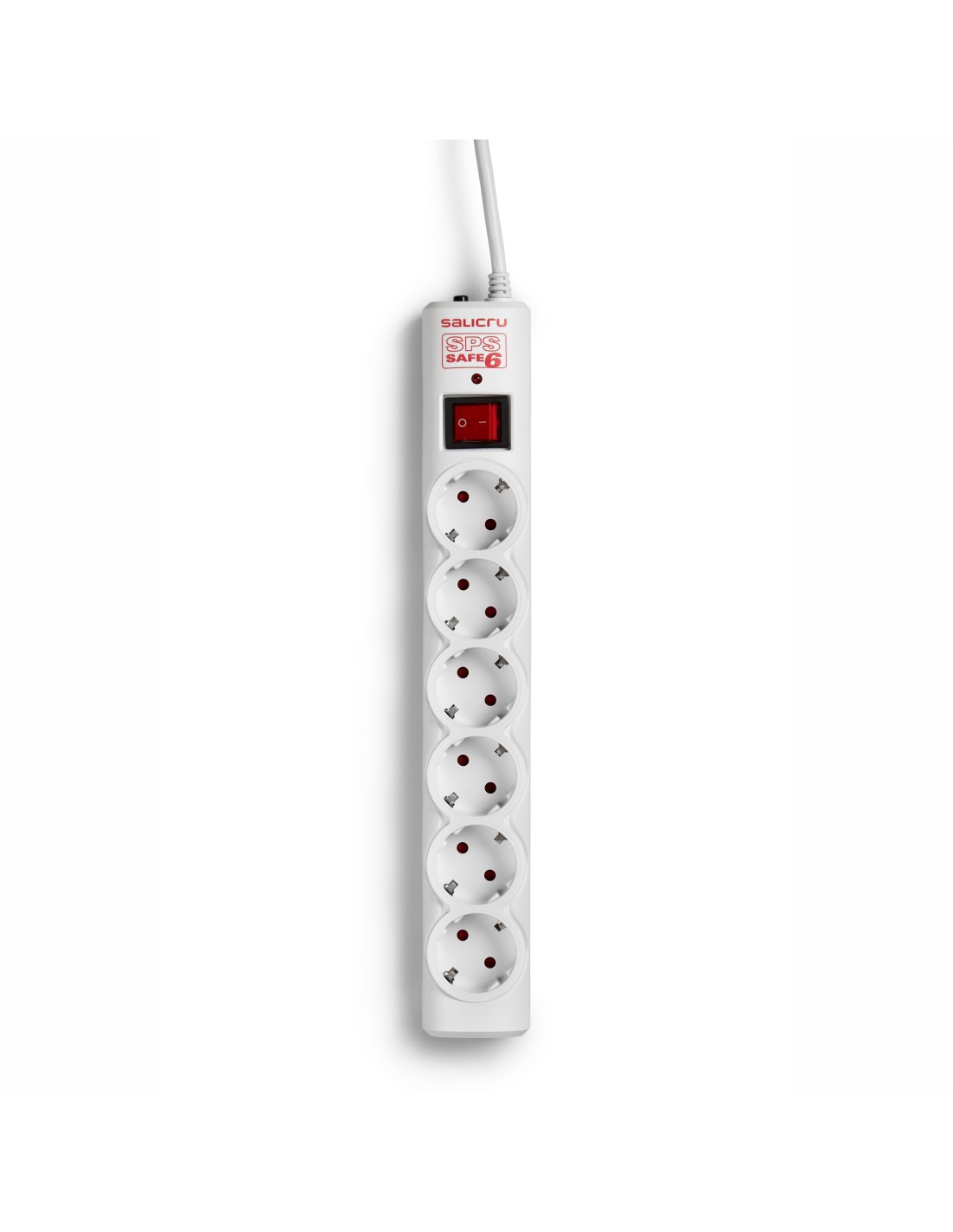 Salicru SPS SAFE 6. Índice de aumento de energía: 238 J, Cantidad de salidas AC: 6 salidas AC, Tipo de salida AC: Tipo F. Color del producto: Blanco, Tiempo de respuesta: 1 ms. Longitud de cable: 1,5 m, Peso: 420 g, Ancho: 53 mm. Certificación: IEC-60884-1; EN-61643-11; EN-61643-21, ISO 9001, ISO 14001. Número de productos incluidos: 1 pieza(s)