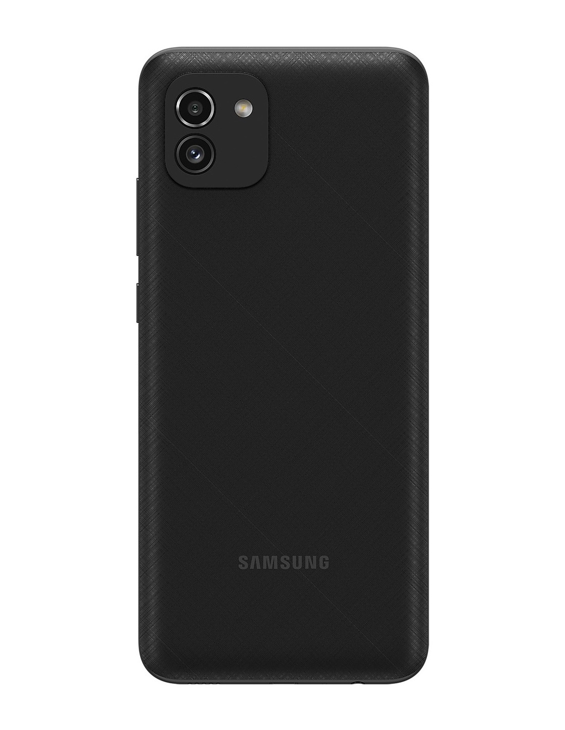 Samsung Galaxy A03 . Diagonal de la pantalla: 16,5 cm (6.5"), Resolución de la pantalla: 720 x 1600 Pixeles. Frecuencia del procesador: 1,6 GHz, Familia de procesador: Unisoc, Modelo del procesador: UMS9230. Capacidad de RAM: 4 GB, Capacidad de almacenamiento interno: 64 GB. Resolución de la cámara trasera (numérica): 48 MP, Tipo de cámara trasera: Cámara doble. Capacidad de la tarjeta SIM: SIM doble. Sistema operativo instalado: Android 11. Capacidad de batería: 5000 mAh. Color del producto: Negro. Peso: 199 g