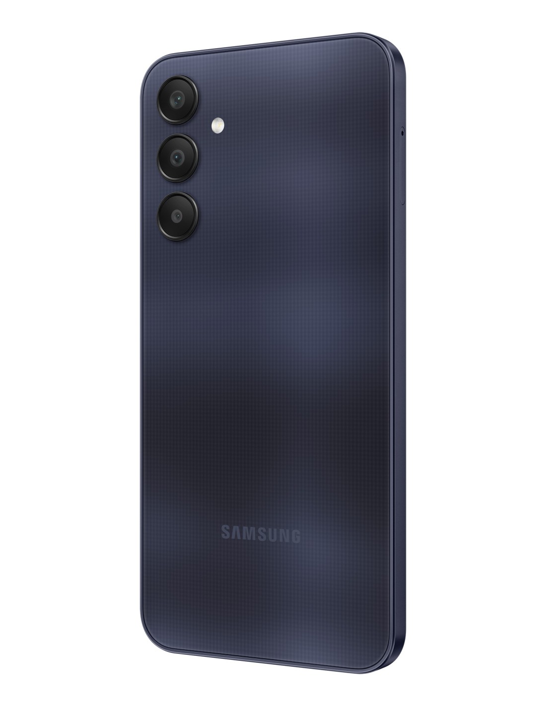 Samsung Galaxy A25 5G SM-A256B. Diagonal de la pantalla: 16,5 cm (6.5"), Resolución de la pantalla: 1080 x 2340 Pixeles. Frecuencia del procesador: 2 GHz, Familia de procesador: Samsung Exynos, Modelo del procesador: 1280. Capacidad de RAM: 6 GB, Capacidad de almacenamiento interno: 128 GB. Resolución de la cámara trasera (numérica): 50 MP, Tipo de cámara trasera: Triple cámara. Capacidad de la tarjeta SIM: SIM doble. Sistema operativo instalado: Android 14. Capacidad de batería: 5000 mAh. Color del producto: Negro, Azul. Peso: 197 g