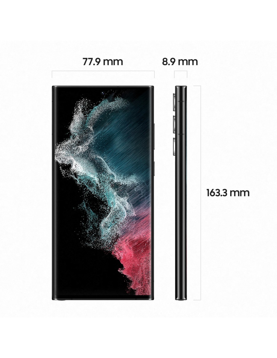 Samsung Galaxy S22 Ultra SM-S908B. Diagonal de la pantalla: 17,3 cm (6.8"), Resolución de la pantalla: 1440 x 3088 Pixeles. Frecuencia del procesador: 2,8 GHz, Familia de procesador: Samsung Exynos, Modelo del procesador: 2200. Capacidad de RAM: 8 GB, Capacidad de almacenamiento interno: 128 GB. Resolución de la cámara trasera (numérica): 108 MP, Tipo de cámara trasera: Cámara cuádruple. Capacidad de la tarjeta SIM: SIM doble. Sistema operativo instalado: Android 12. Capacidad de batería: 5000 mAh. Color del producto: Negro. Peso: 228 g