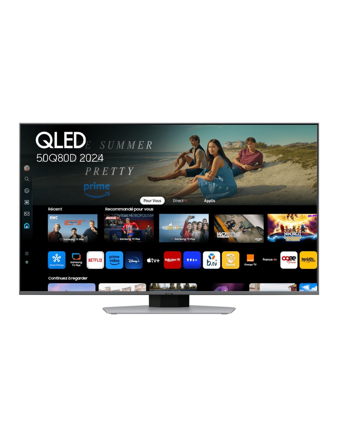 Samsung TQ50Q80DAT. Diagonal de la pantalla: 127 cm (50"), Resolución de la pantalla: 3840 x 2160 Pixeles, Tipo HD: 4K Ultra HD, Tecnología de visualización: QLED, Forma de la pantalla: Plana. Smart TV. Tecnología de interpolación de movimiento: Motion Xcelerator, Relación de aspecto nativa: 16:9. Formato de señal digital: DVB-C, DVB-S2, DVB-T2. Wifi, Ethernet. Color del producto: Plata