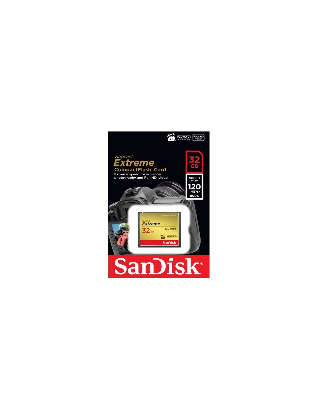 SanDisk 32GB Extreme. Capacidad: 32 GB, Tipo de tarjeta flash: CompactFlash, Velocidad de lectura: 120 MB/s, Velocidad de escritura: 85 MB/s. Color del producto: Negro, Oro, Rojo