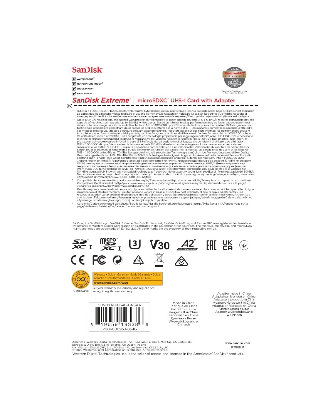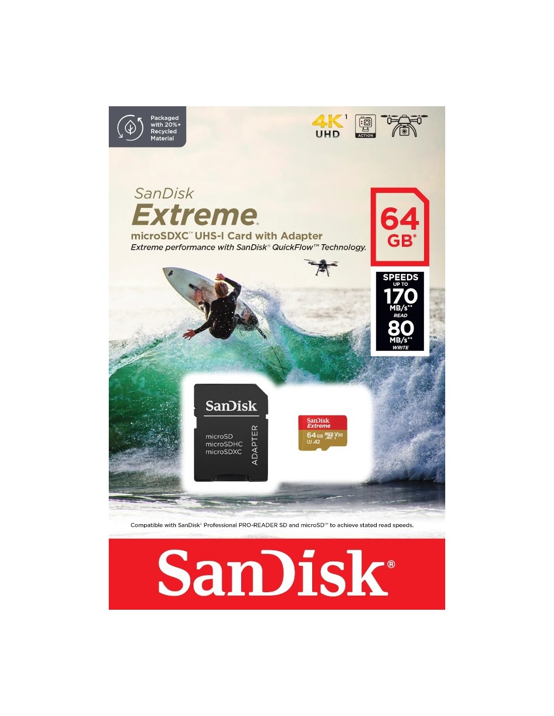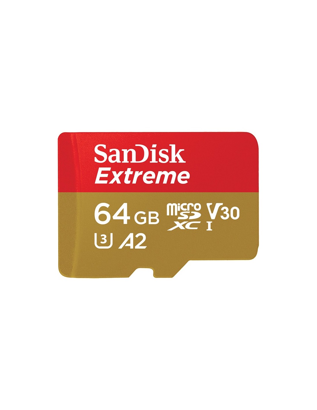 SanDisk Extreme. Capacidad: 64 GB, Tipo de tarjeta flash: MicroSDXC, Clase de memoria flash: Clase 10, Tipo de memoria interna: UHS-I, Velocidad de lectura: 170 MB/s, Velocidad de escritura: 80 MB/s, Clase de velocidad UHS: Class 3 (U3), Clase de velocidad de vídeo: V30. Funciones de protección: Resistente a golpes, Resistente al agua, A prueba de rayos X, Color del producto: Oro, Rojo