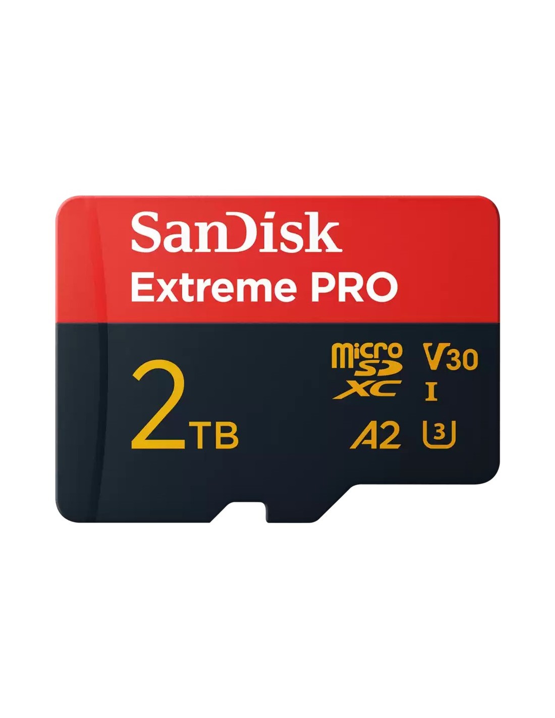 SanDisk Extreme PRO. Capacidad: 2 TB, Tipo de tarjeta flash: MicroSDXC, Clase de memoria flash: Clase 10, Tipo de memoria interna: UHS-I, Velocidad de lectura: 250 MB/s, Velocidad de escritura: 150 MB/s, Clase de velocidad UHS: Class 3 (U3), Clase de velocidad de vídeo: V30. Funciones de protección: Protección contra caídas, Protección contra campos magnéticos, Resistente a golpes, Resistente..., Color del producto: Negro, Rojo