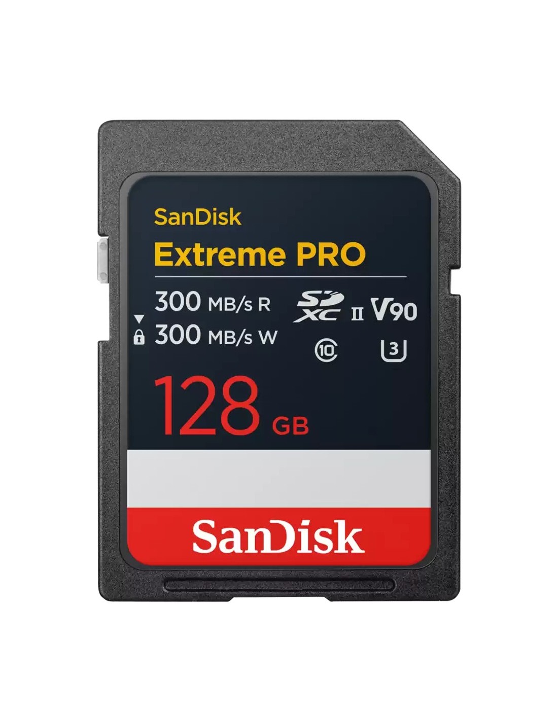 SanDisk Extreme PRO. Capacidad: 128 GB, Tipo de tarjeta flash: SDXC, Clase de memoria flash: Clase 10, Tipo de memoria interna: UHS-II, Velocidad de lectura: 300 MB/s, Velocidad de escritura: 300 MB/s, Clase de velocidad UHS: Class 3 (U3), Clase de velocidad de vídeo: V90. Funciones de protección: Protección contra caídas, Resistente al polvo, Color del producto: Negro