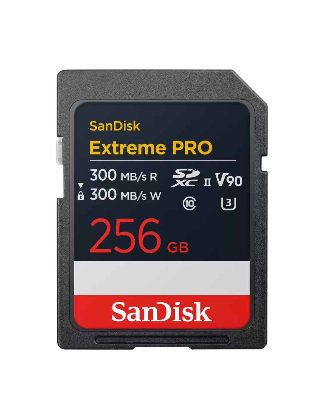 SanDisk Extreme PRO. Capacidad: 256 GB, Tipo de tarjeta flash: SDXC, Clase de memoria flash: Clase 10, Tipo de memoria interna: UHS-II, Velocidad de lectura: 300 MB/s, Velocidad de escritura: 300 MB/s, Clase de velocidad UHS: Class 3 (U3), Clase de velocidad de vídeo: V90. Funciones de protección: Protección contra caídas, Resistente al polvo, Color del producto: Negro