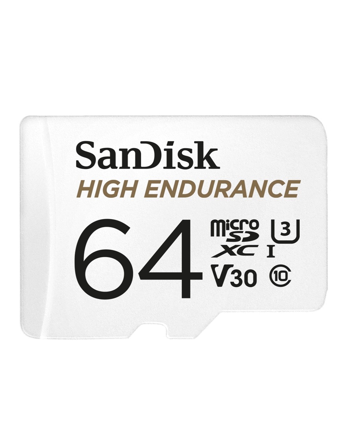 SanDisk High Endurance. Capacidad: 64 GB, Tipo de tarjeta flash: MicroSDXC, Clase de memoria flash: Clase 10, Tipo de memoria interna: UHS-I, Velocidad de lectura: 100 MB/s, Velocidad de escritura: 40 MB/s, Clase de velocidad UHS: Class 3 (U3), Clase de velocidad de vídeo: V30. Funciones de protección: Resistente a golpes, Resistente a la temperatura, Resistente al agua, Color del producto: Blanco