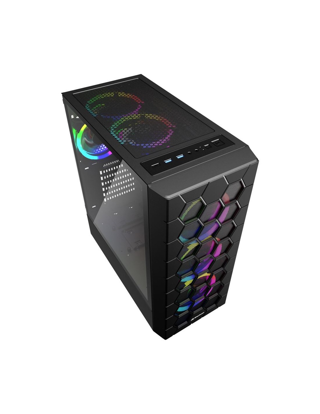 Magnífico aspecto con un alto rendimiento: la RGB Hex no solo aporta un toque vanguardista con su diseño hexagonal en 3D en el panel frontal permeable al aire, sino que también mantiene el ordenador refrigerado, sin importar lo ardiente que se ponga la partida. Lo garantizan los seis ventiladores preinstalados que, además, cuentan con iluminación RGB direccionable. Es más, la caja midi-ATX cuenta con mucho espacio para hardware, además de con un moderno puerto USB tipo C 3.2 de segunda generación y un panel lateral de cristal templado.