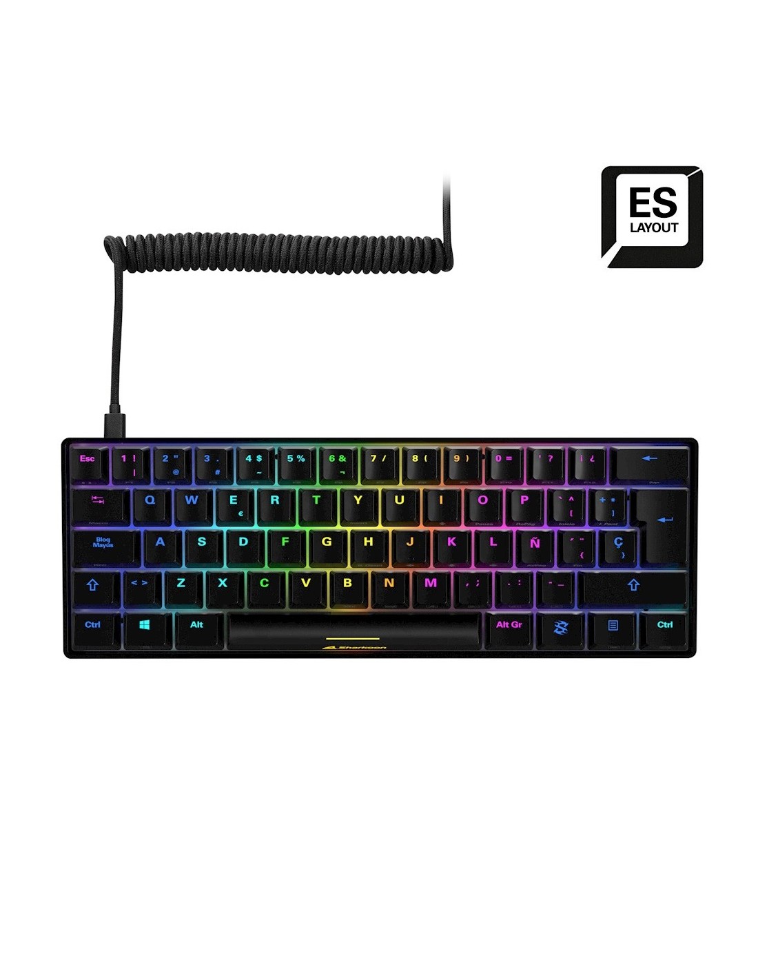 Con el SKILLER SGK50 S4, Sharkoon presenta su primer teclado gaming con diseño 60%. Todas las funciones están combinadas en un formato compacto, y gracias a su diseño hot-swap, se pueden instalar a deseo interruptores intercambiables con 3 o 5 pines. Para una mayor personalización hay 3 diferentes tipos de interruptores Kailh entre los que podemos elegir. También se pueden grabar y guardar fácilmente macros con hasta 16 acciones. El cable en espiral aporta al SKILLER SGK50 S4 una apariencia elegante y el teclado tiene 2 pares de pies para regular el teclado a la altura deseada.