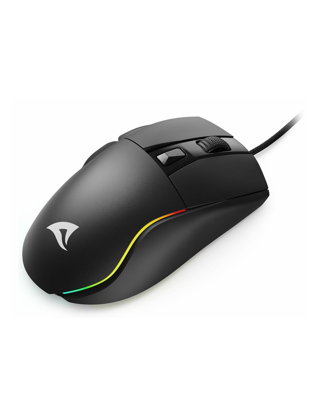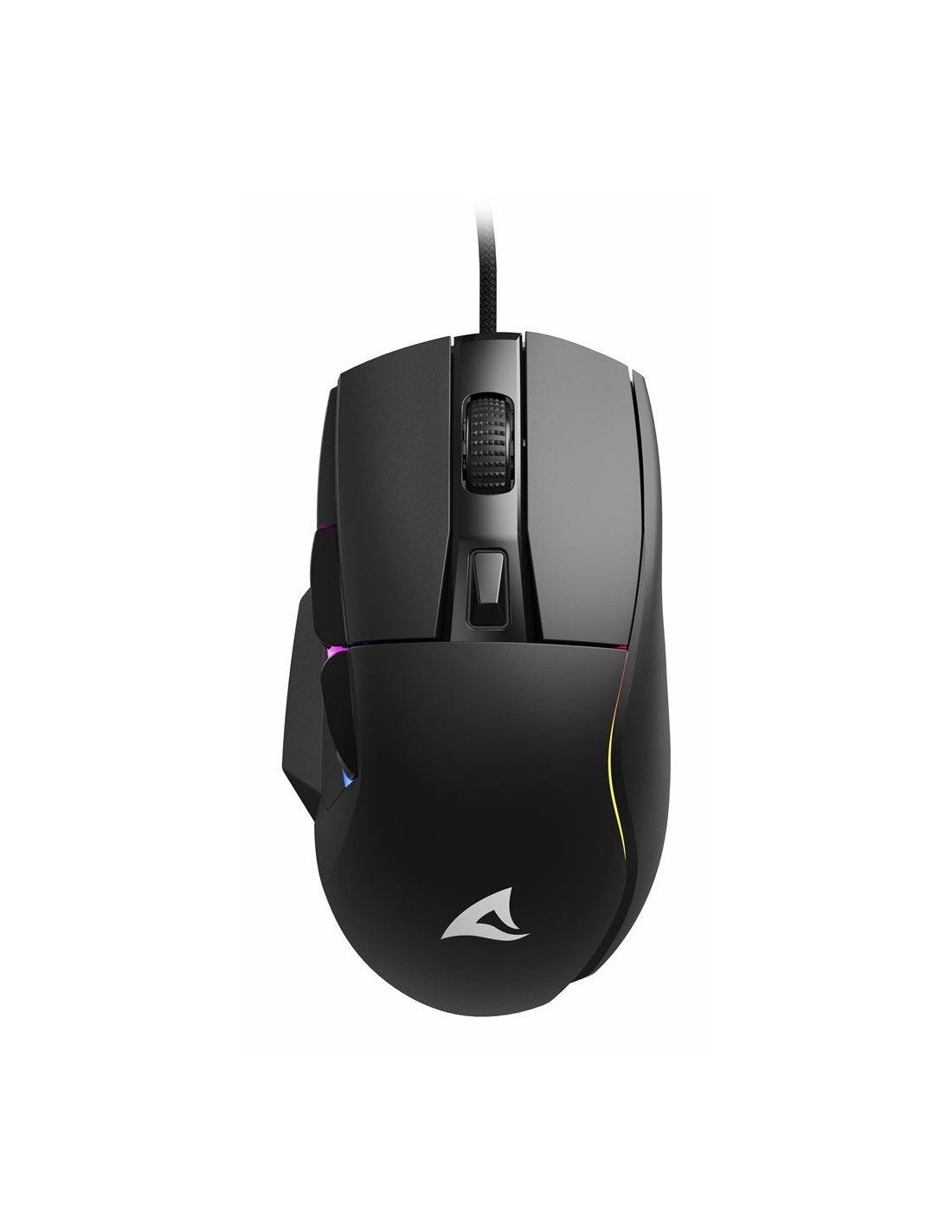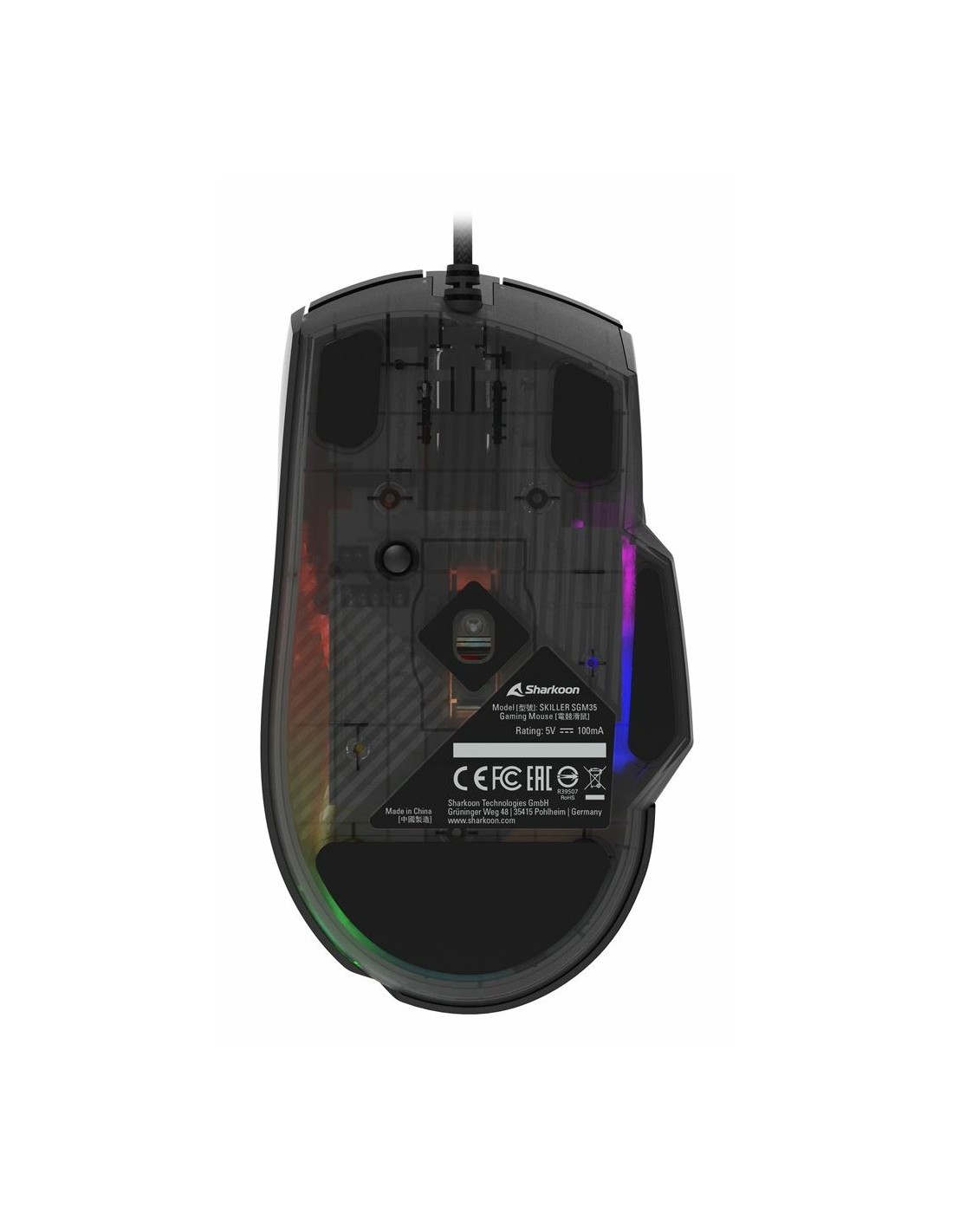 Sharkoon SGM35. Factor de forma: mano derecha. Tecnología de detección de movimientos: Óptico, Interfaz del dispositivo: USB tipo A, Resolución de movimiento: 6400 DPI, Tipo de botones: Botones presionados, Cantidad de botones: 6, Tipo de desplazamiento: Rueda, Aceleración (máx.): 20 G. Iluminación de color: Multi. Fuente de energía: Cable. Color del producto: Negro