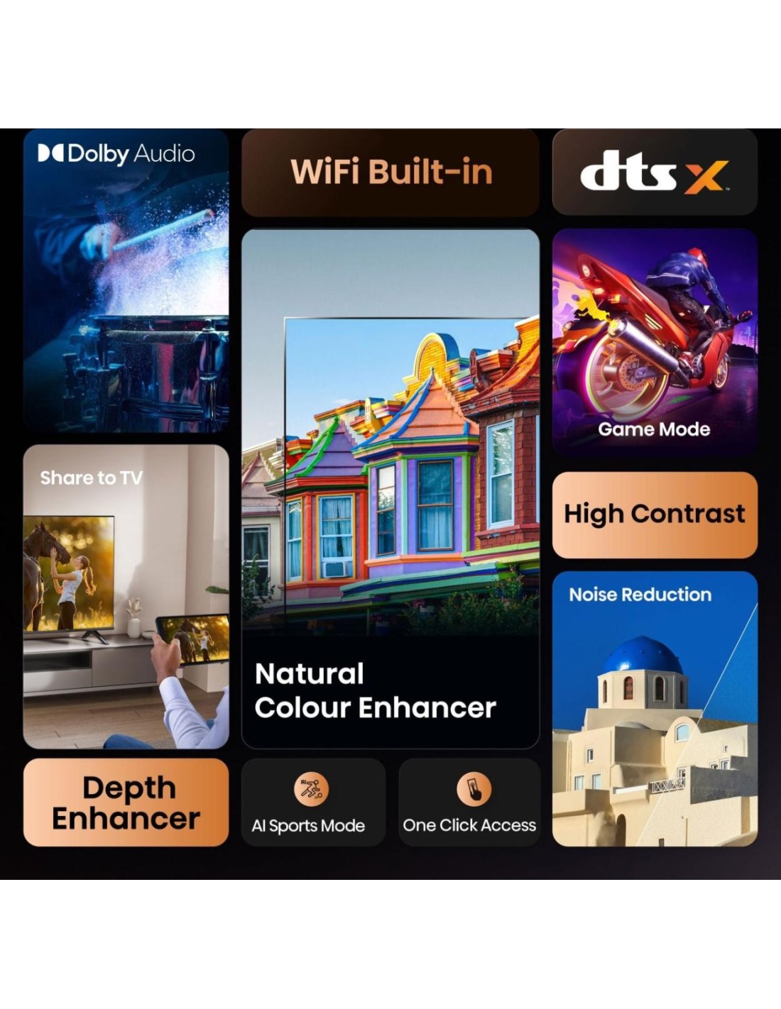 Hisense 32A4Q. Diagonal de la pantalla: 81,3 cm (32"), Resolución de la pantalla: 1366 x 768 Pixeles, Tipo HD: HD, Tecnología de visualización: DLED, Forma de la pantalla: Plana. Smart TV. Tiempo de respuesta: 8,5 ms, Razón de contraste (típica): 3000:1, Relación de aspecto nativa: 16:9. Formato de señal digital: DVB-C, DVB-S, DVB-S2, DVB-T, DVB-T2. Wifi, Ethernet. Color del producto: Negro