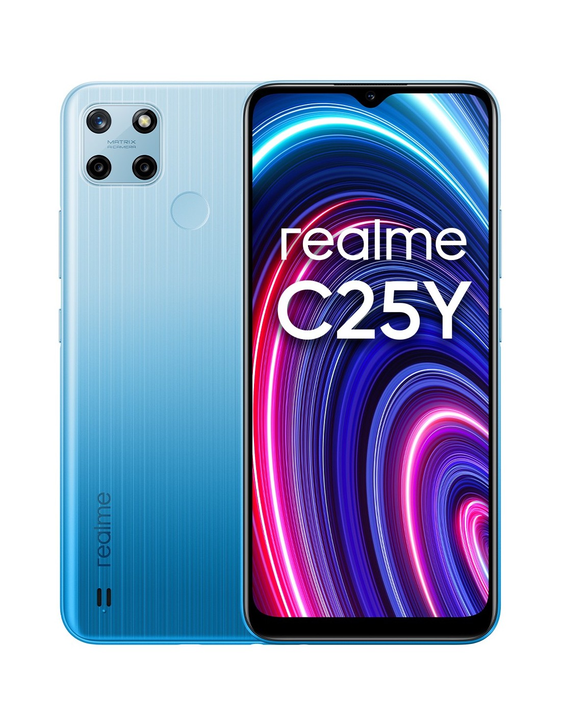 realme C C25Y. Diagonal de la pantalla: 16,5 cm (6.5"), Resolución de la pantalla: 720 x 1600 Pixeles. Familia de procesador: Unisoc, Modelo del procesador: T618. Capacidad de RAM: 4 GB, Tipo de RAM: LPDDR4X, Capacidad de almacenamiento interno: 128 GB. Resolución de la cámara trasera (numérica): 50 MP, Tipo de cámara trasera: Triple cámara. Capacidad de la tarjeta SIM: SIM doble. Sistema operativo instalado: Android 11. Capacidad de batería: 5000 mAh. Color del producto: Azul. Peso: 200 g