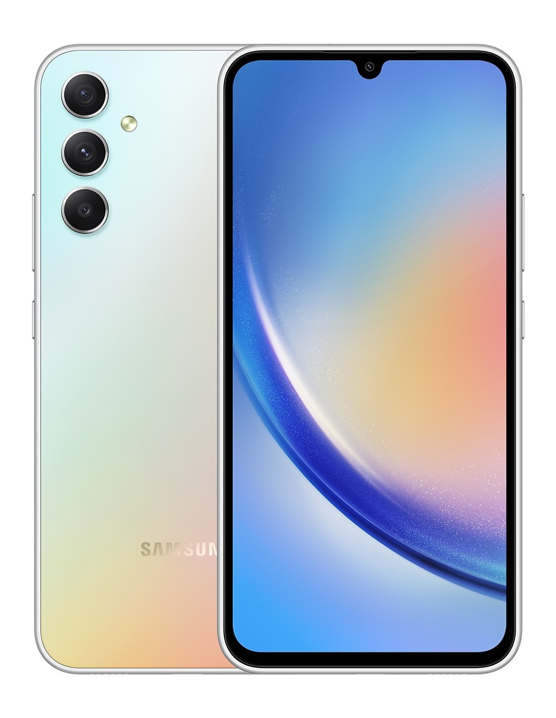 Samsung Galaxy A34 5G . Diagonal de la pantalla: 16,8 cm (6.6"), Resolución de la pantalla: 1080 x 2340 Pixeles. Frecuencia del procesador: 2 GHz, Familia de procesador: MediaTek, Modelo del procesador: Dimensity 1080. Capacidad de RAM: 8 GB, Capacidad de almacenamiento interno: 256 GB. Resolución de la cámara trasera (numérica): 48 MP, Tipo de cámara trasera: Triple cámara. Capacidad de la tarjeta SIM: Ranura híbrida Dual SIM. Capacidad de batería: 5000 mAh. Color del producto: Plata. Peso: 199 g